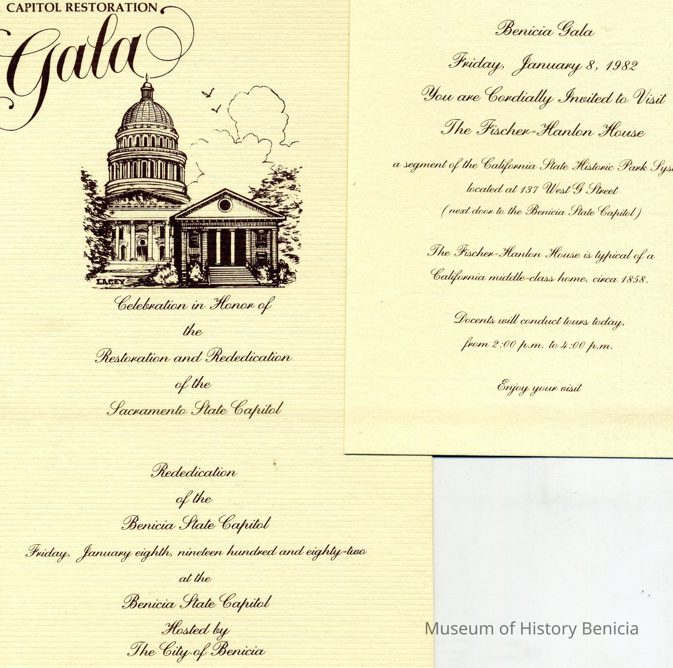 Besides the agenda for the program there is a listing of the Committee Members and Acknowledgements; includes a card insert with an invitation to docent tours of the Fischer-Hanlon House, next door to the Capitol Building in Benicia 2:00 p.m. to 4:00 p.m.