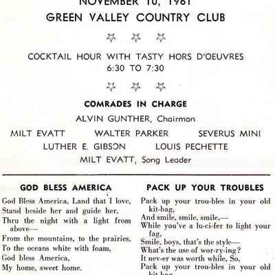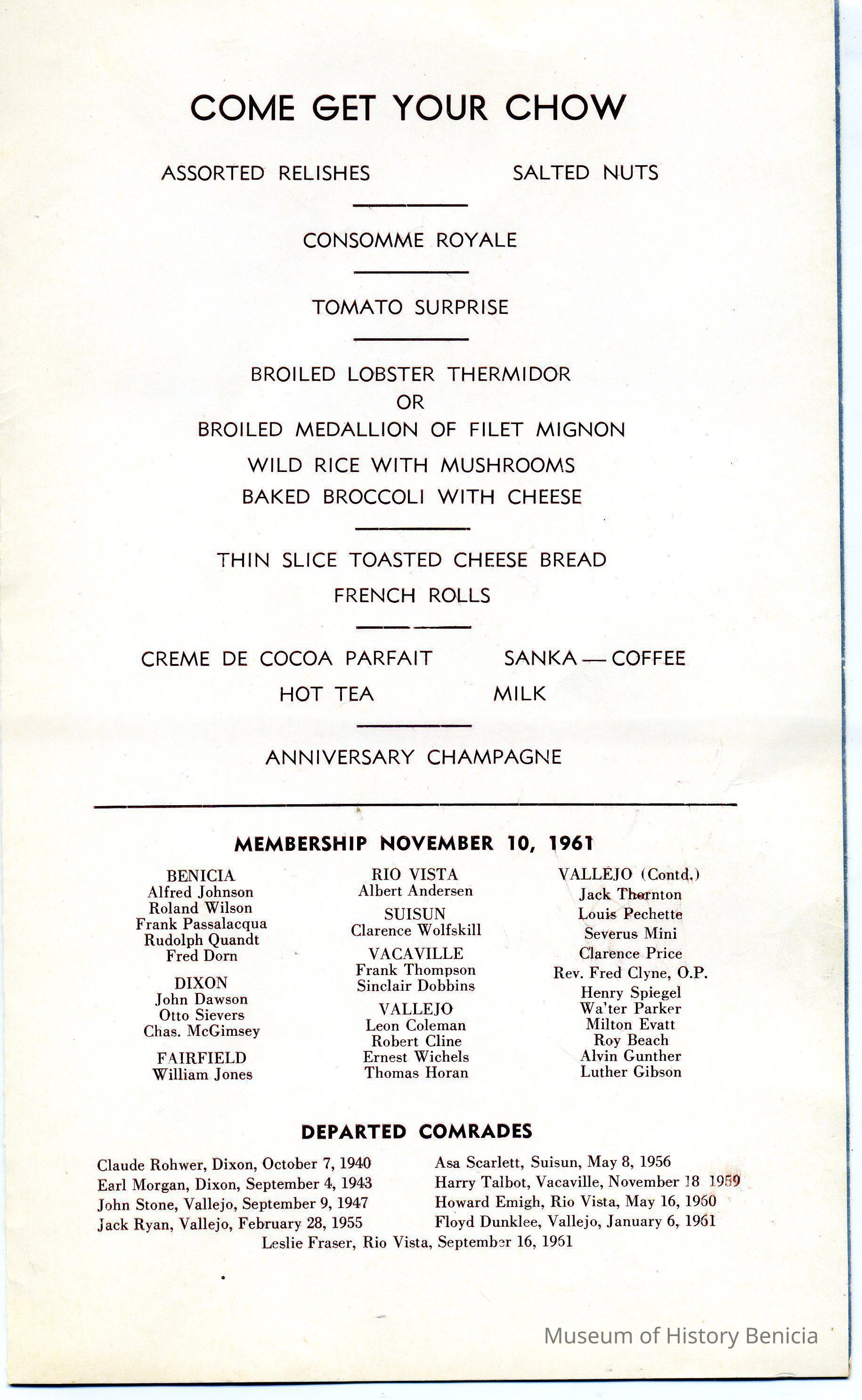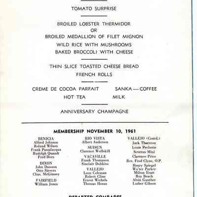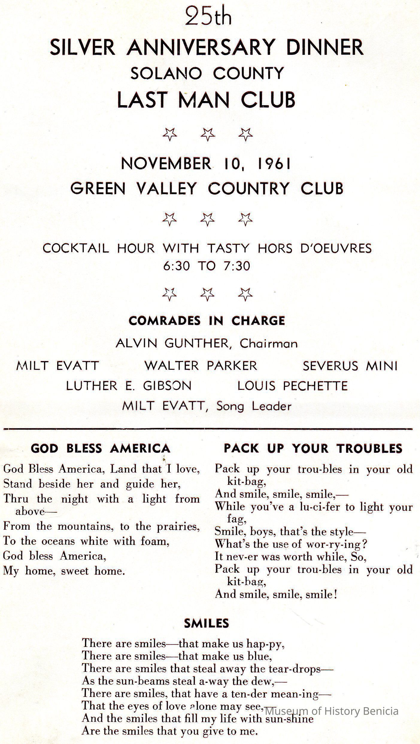 Folded heavy paper program printed in brown on silver front cover "Solano County 37 Last Man Club Organized Nov. 10th 1937"; Inside: "25th Anniversary Dinner Solano County Last Man Club: "November 10, 1961 / Green Valley Country Club"; includes menu and roster of members and those who have "departed".