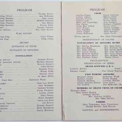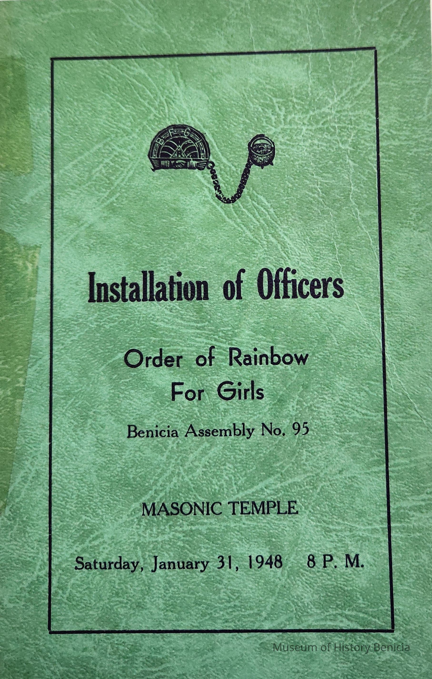 Program - Cover: Installation of Officers / Order of Rainbow / For Girls / Benicia Assembly No. 95 / Masonic Temple / Saturday, January 31, 1948 8 P.M. Inside: Installing Officers, Ceremonies and other Rituals are listed along with proclamations, committees and honored guests. Printed on cardstock: outside is black ink on green and inside is blue ink on off-white.Collection