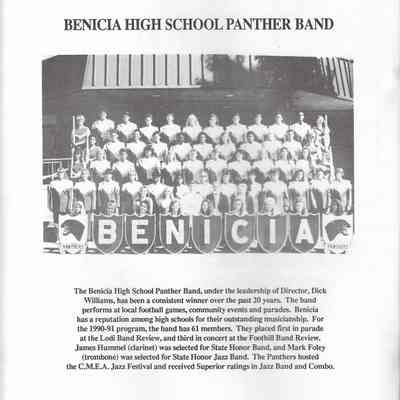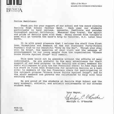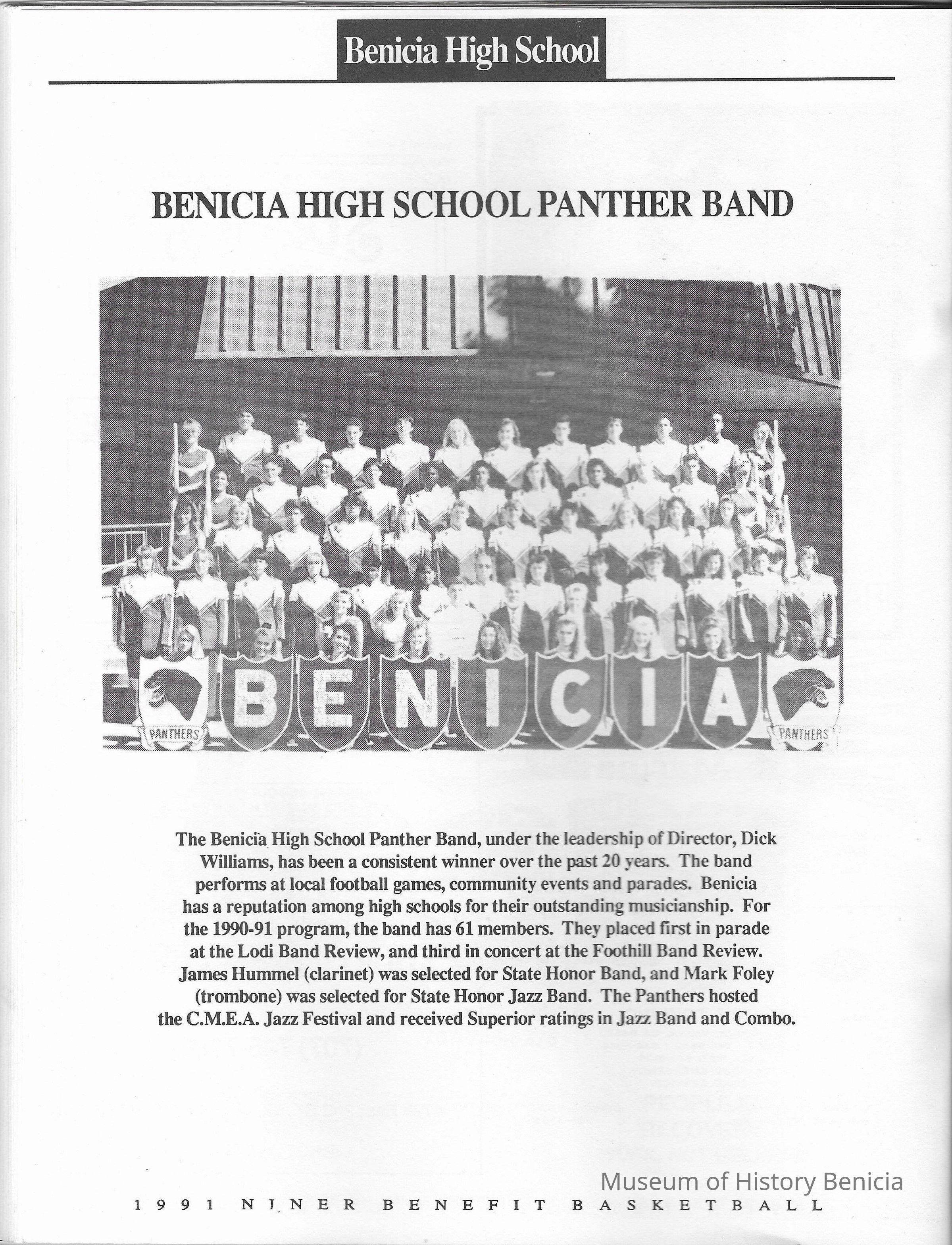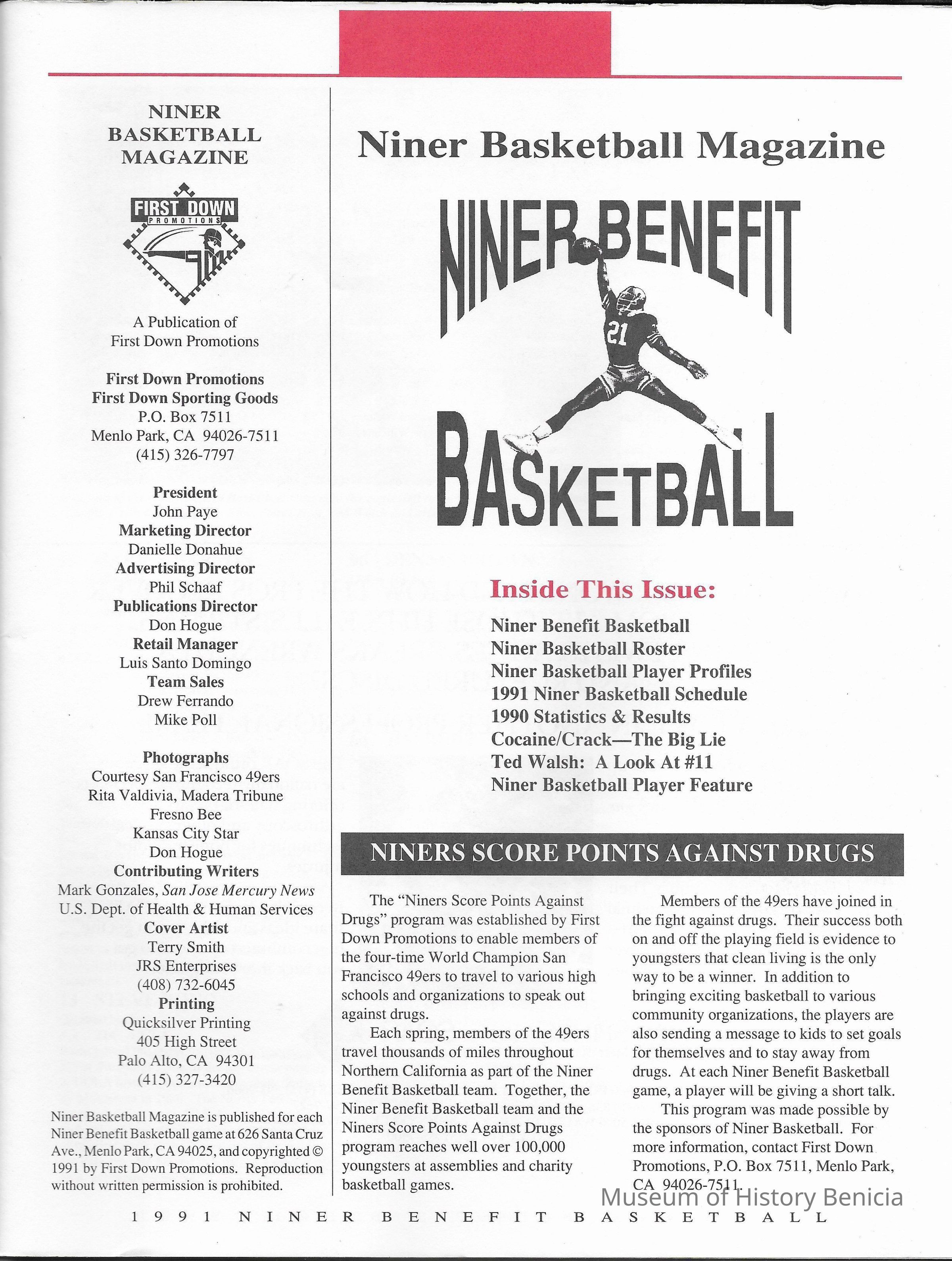 In 1991, SF 49ers players formed a basketball team to play at 48 different high schools in the Bay Area. This program features an introductory letter on page one by Benicia Mayor Marilyn C. O'Rourke thanking the supporters for the school and High School band.