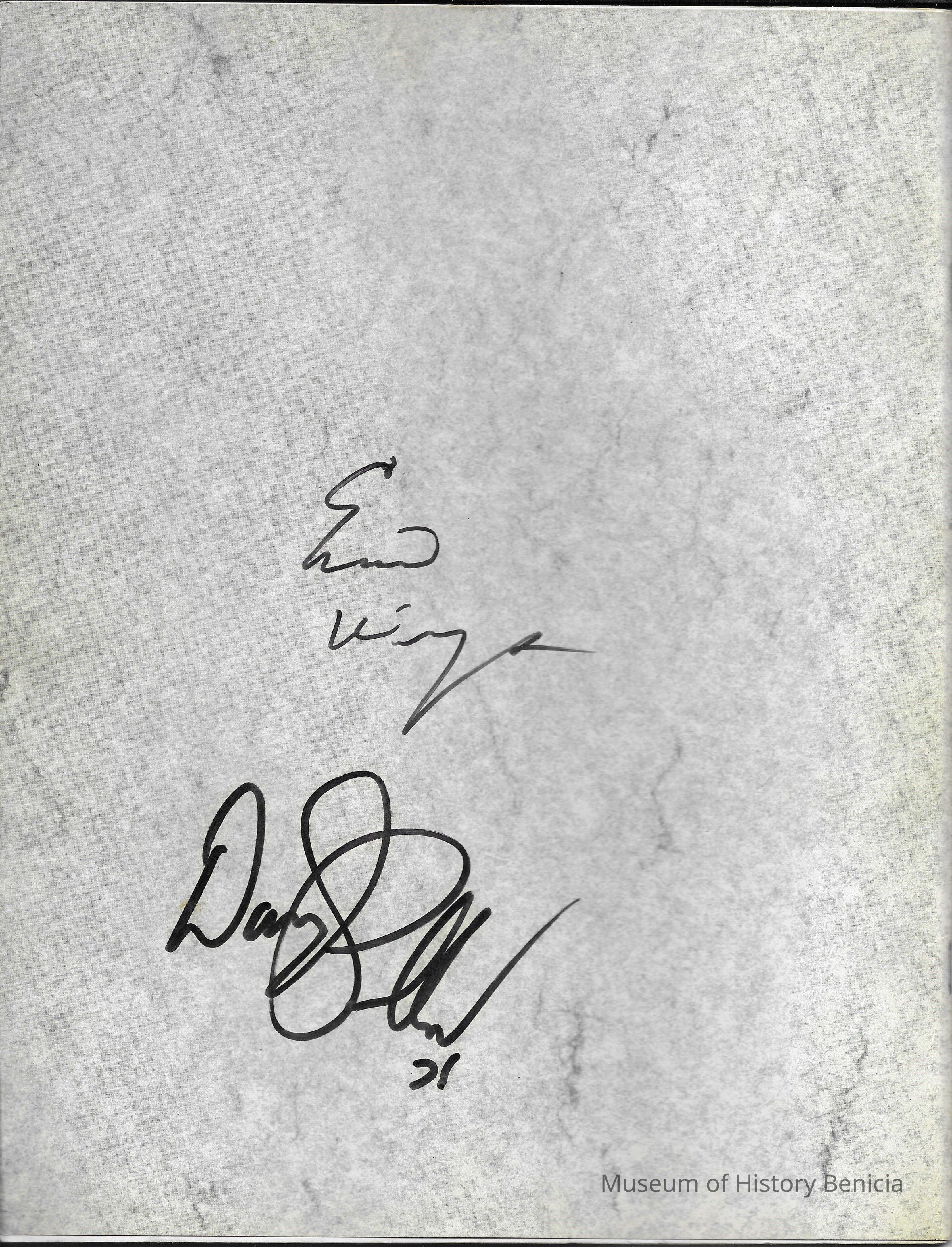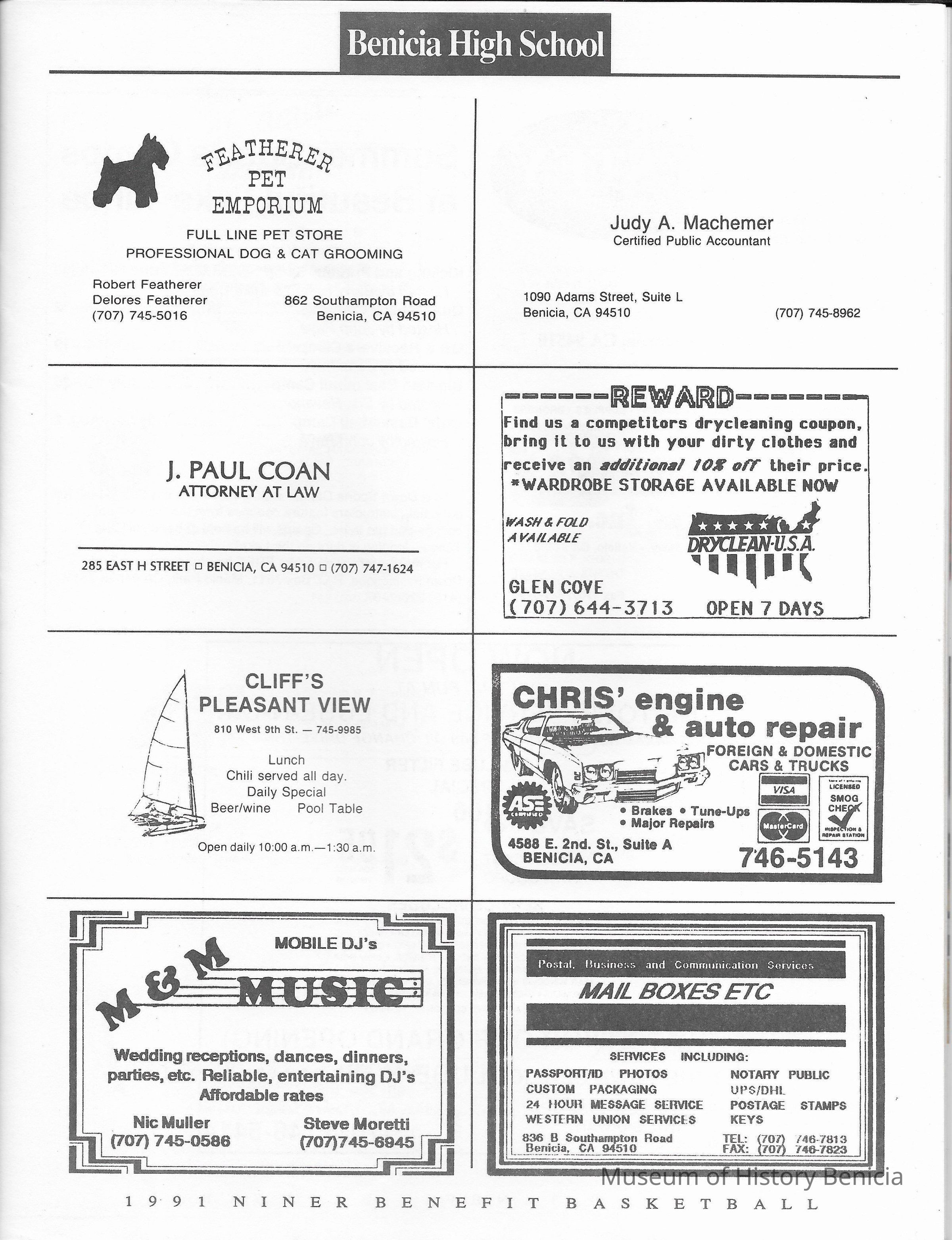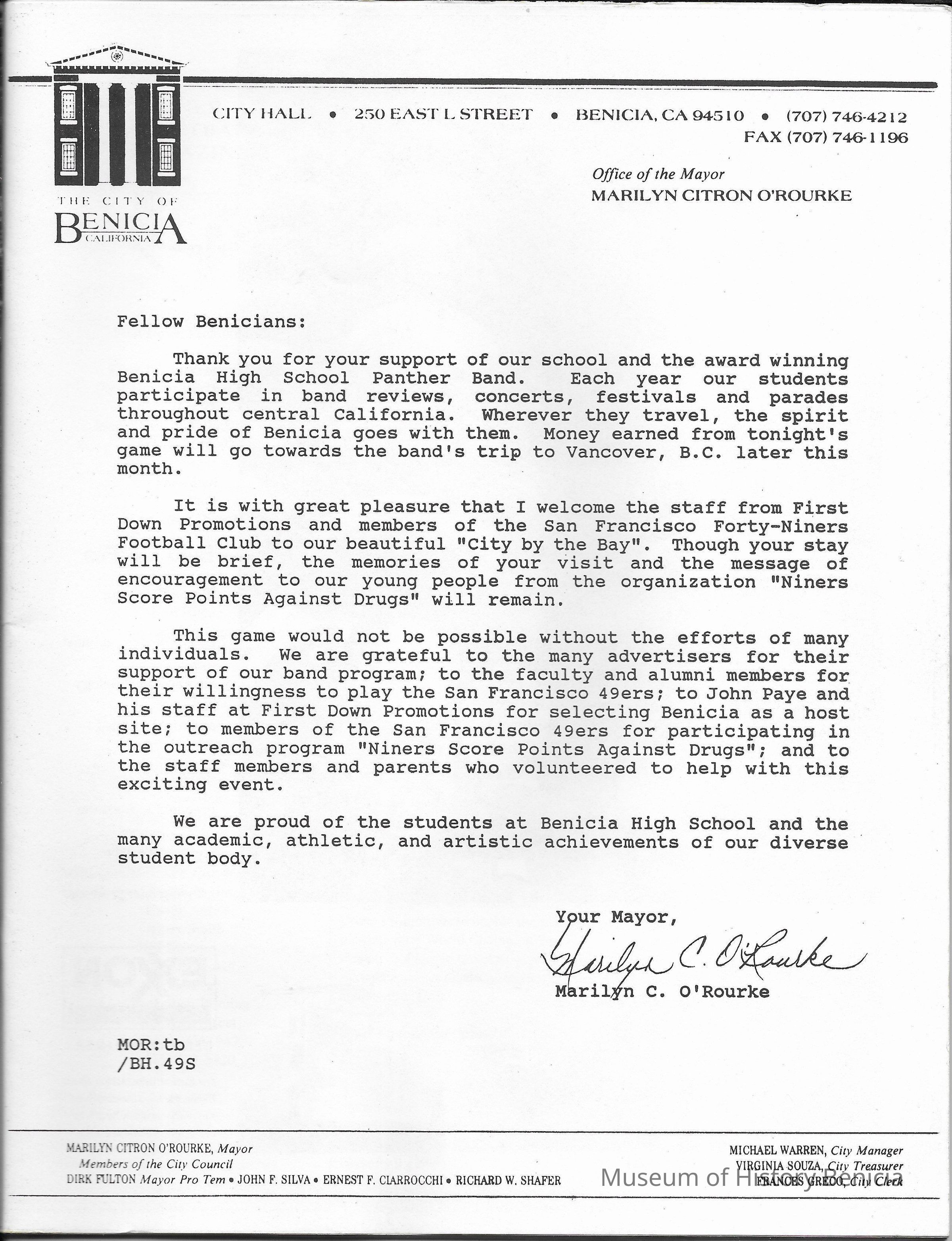 In 1991, SF 49ers players formed a basketball team to play at 48 different high schools in the Bay Area. This program features an introductory letter on page one by Benicia Mayor Marilyn C. O'Rourke thanking the supporters for the school and High School band.