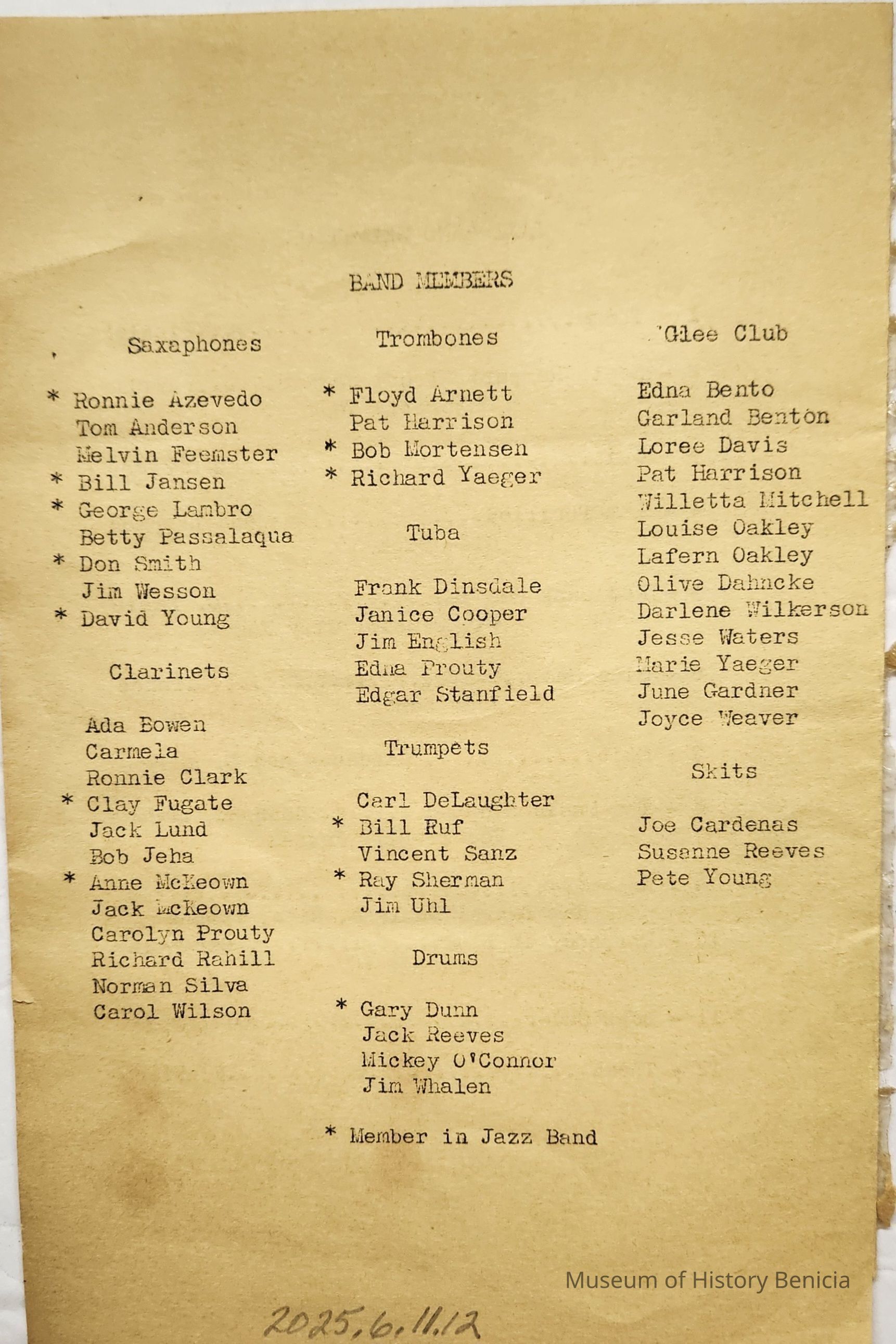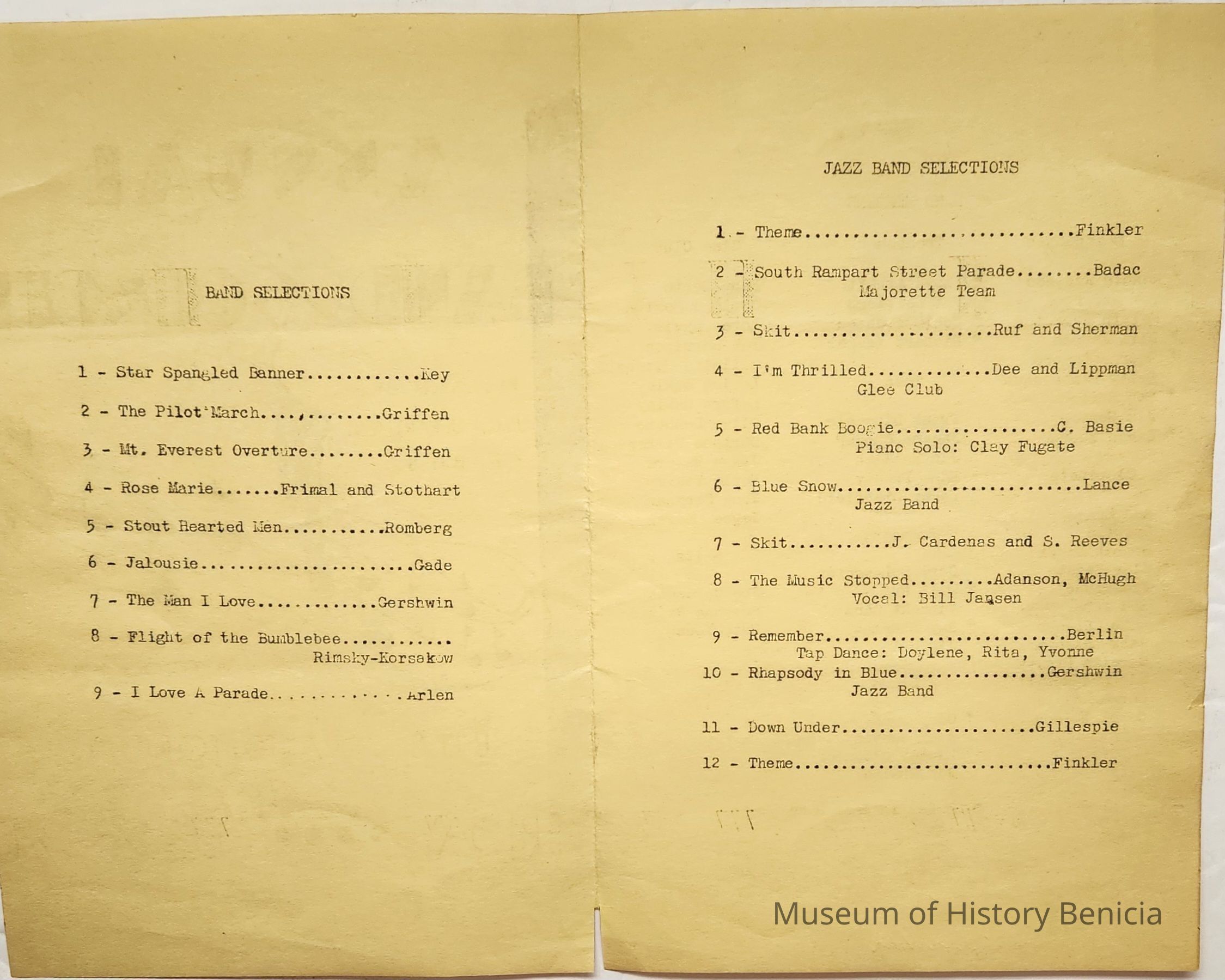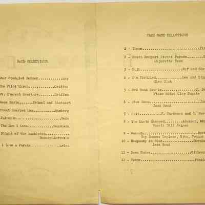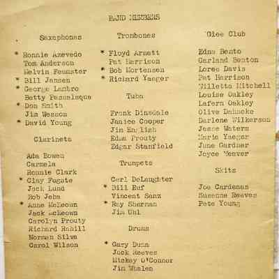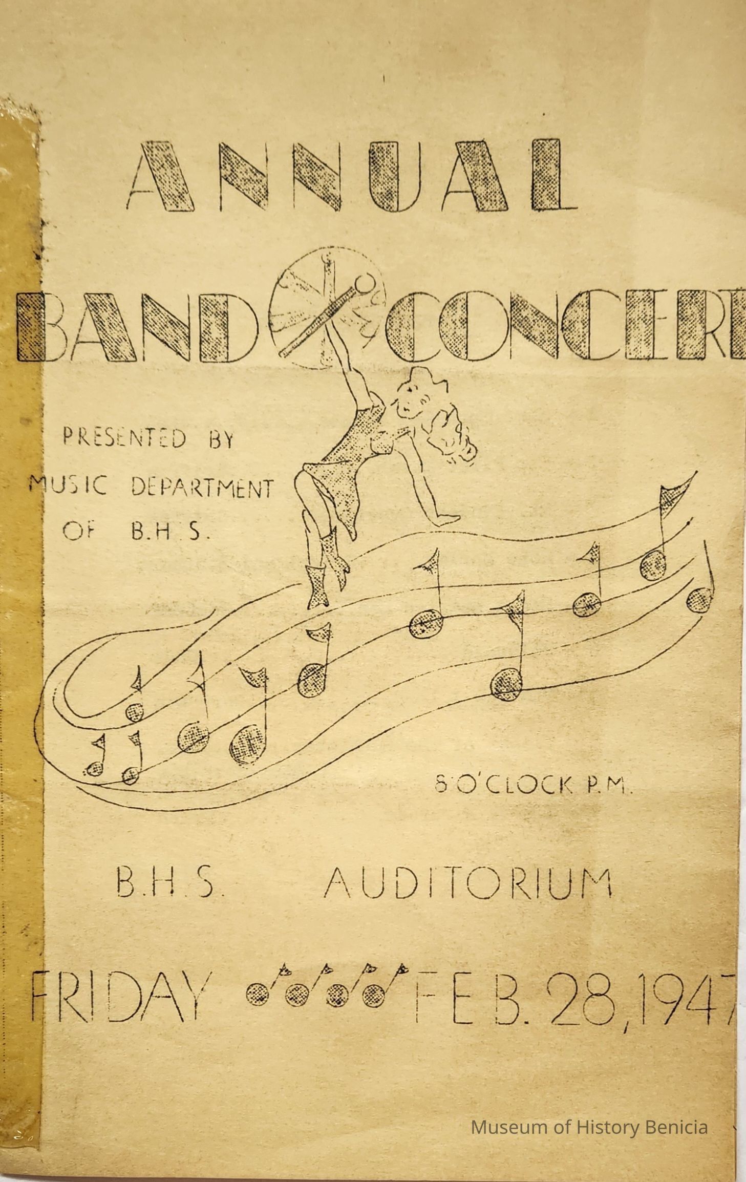 Program for the Annual Band Concert presented by the Music Department of B.H.S. 5 o'clock P.M. BHS Auditorium Friday Feb. 28, 1947. Mimeographed on yellow/gold paper. Inside lists nine band selections on one page and 12 jazz band selections on another page. On the back are listed the student participants by instruments played: saxaphone (sic), clarinets, trombones, tuba, trumpets, drums, and Glee Club and Skits. Jazz band members are indicated by asterisks.Collection