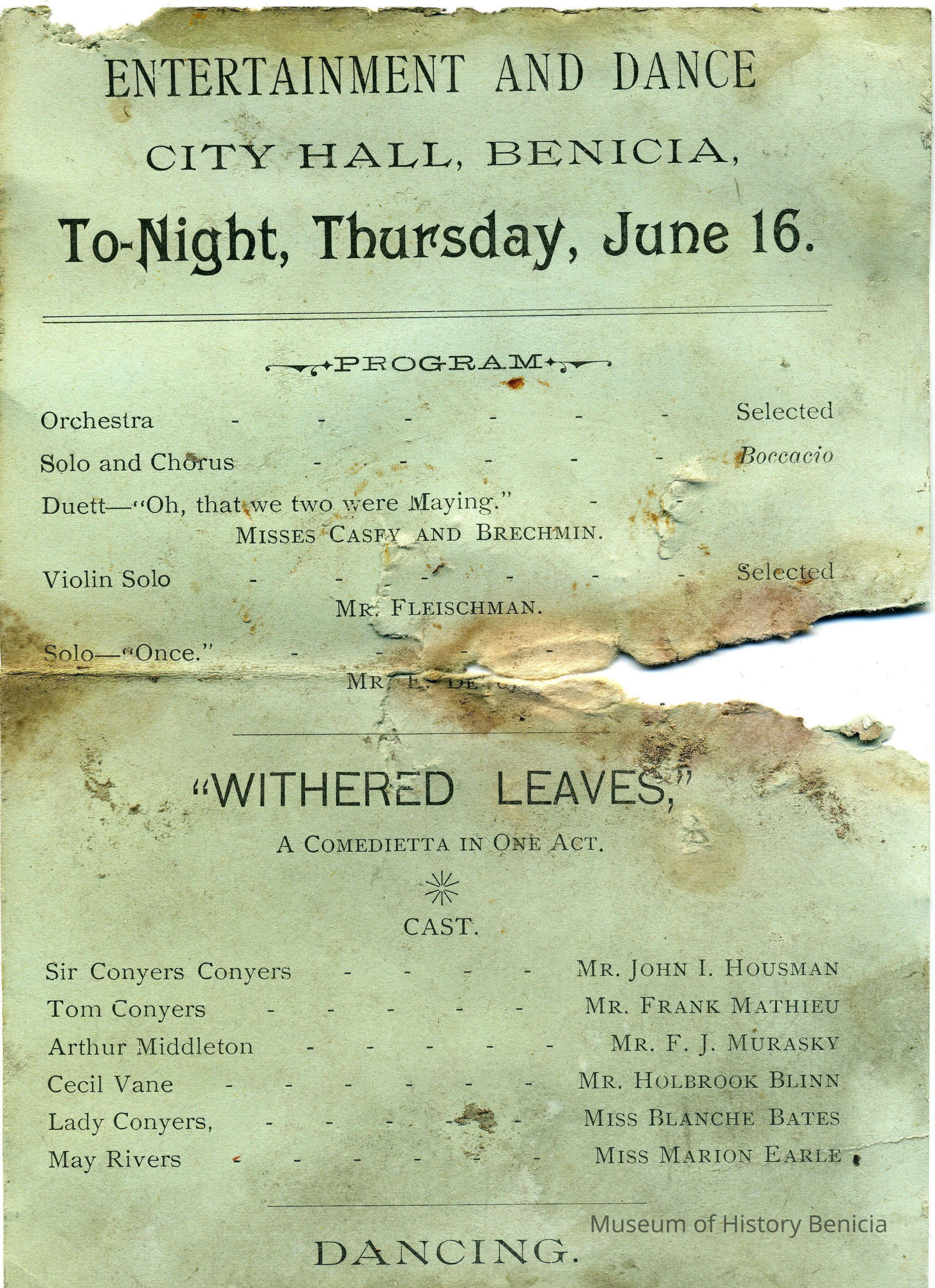 This is a dance program for a dance in Benicia. It is in the City Hall on Thursday, 06/16. There is an orchestra and chorus. Misses Casey and Brechmin will also do a duet. The play is "Withered Leaves".