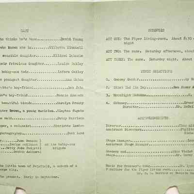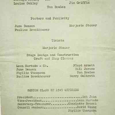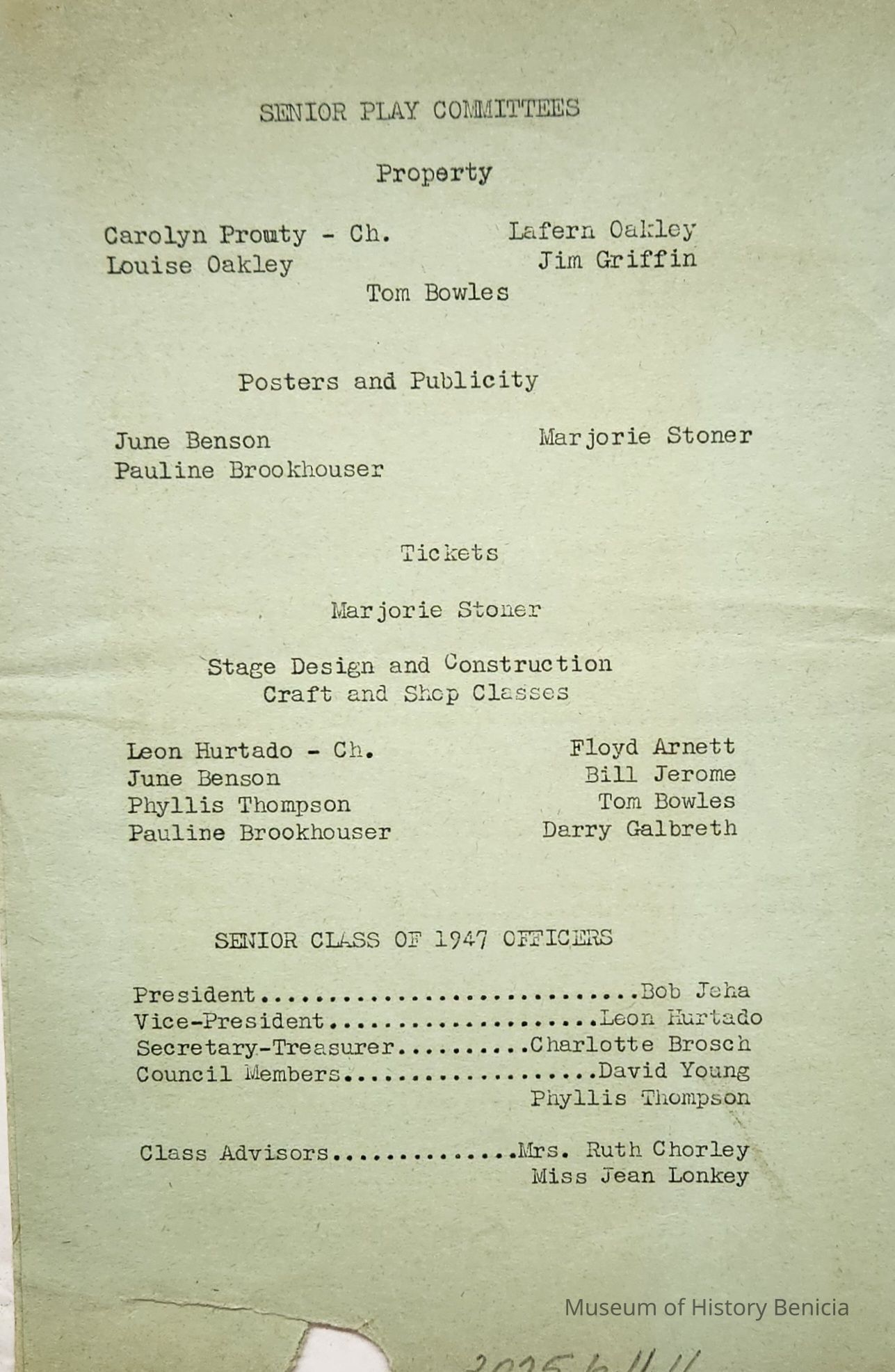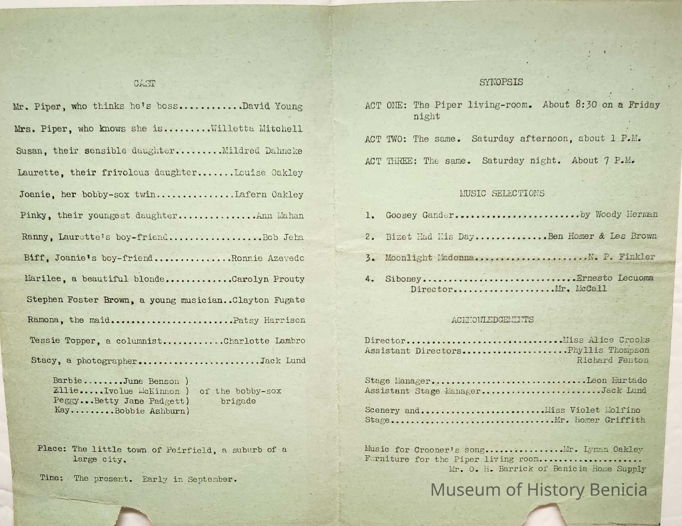 Program - Senior Class of 1947 presents "Sing for Your Supper" a Comedy in three Acts by Ann Coulter Martens / Benicia High School Auditorium, Friday Evening, April 18, 1947 / Produced by special arrangement with The Dramatic Publishing Company of Chicago. The first inside page lists the cast, along with location and time period. The second page lists a synopsis, musical selections, and acknowledgements. The back page contains information on committees and senior class officers. Mimeographed on green paper.Collection
