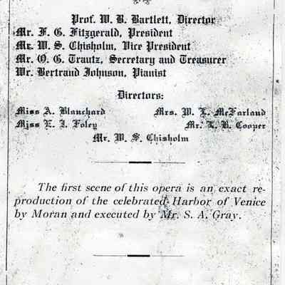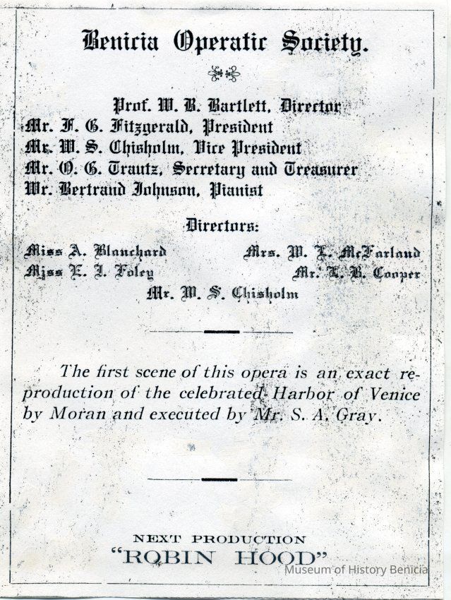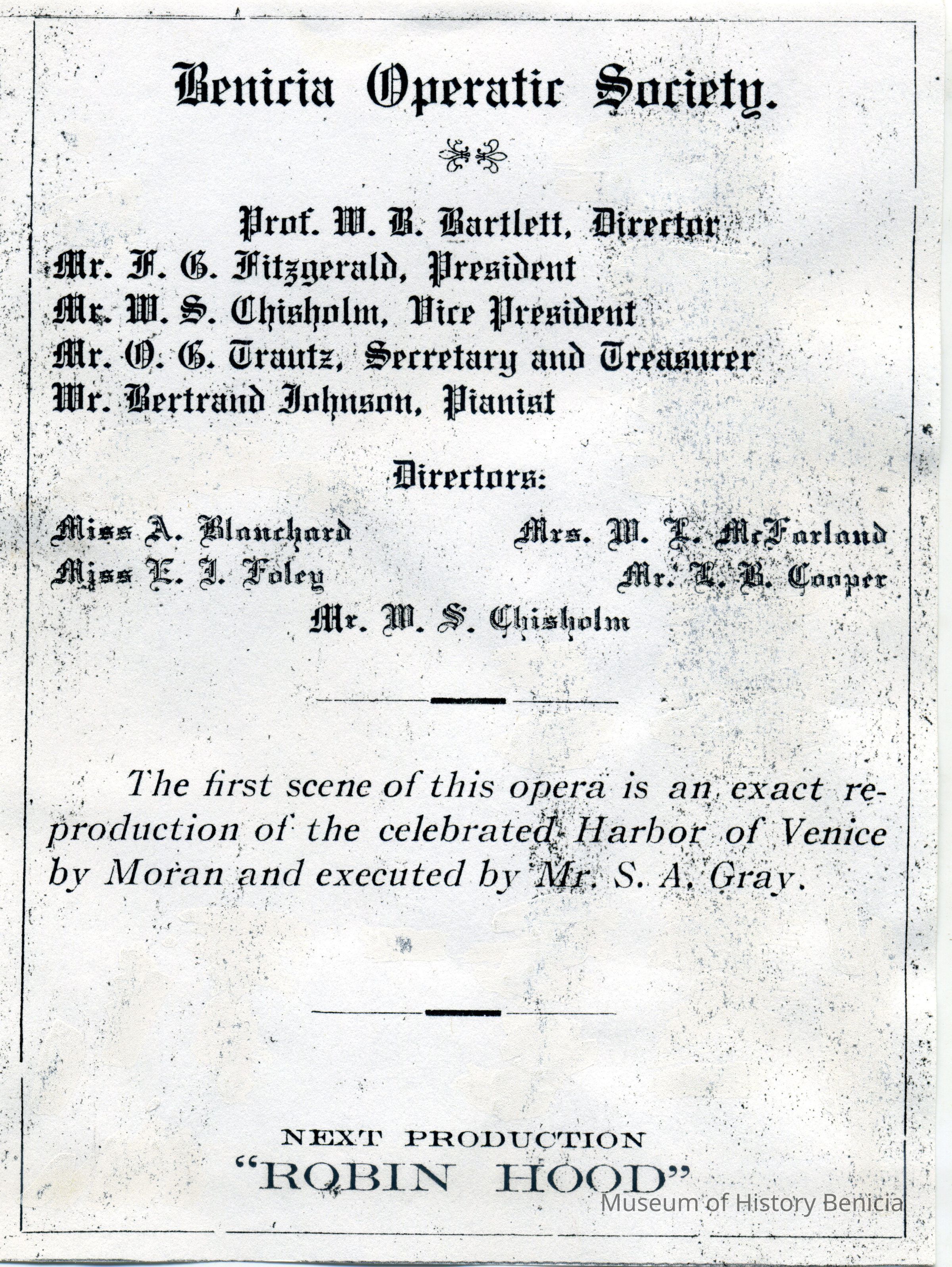 The Benicia performance was after 1891 but not sure when. Shown on the program are Professor Bartlett, M.S. Chisholm, M.L. McFarland, and S.A. Gray.Collection