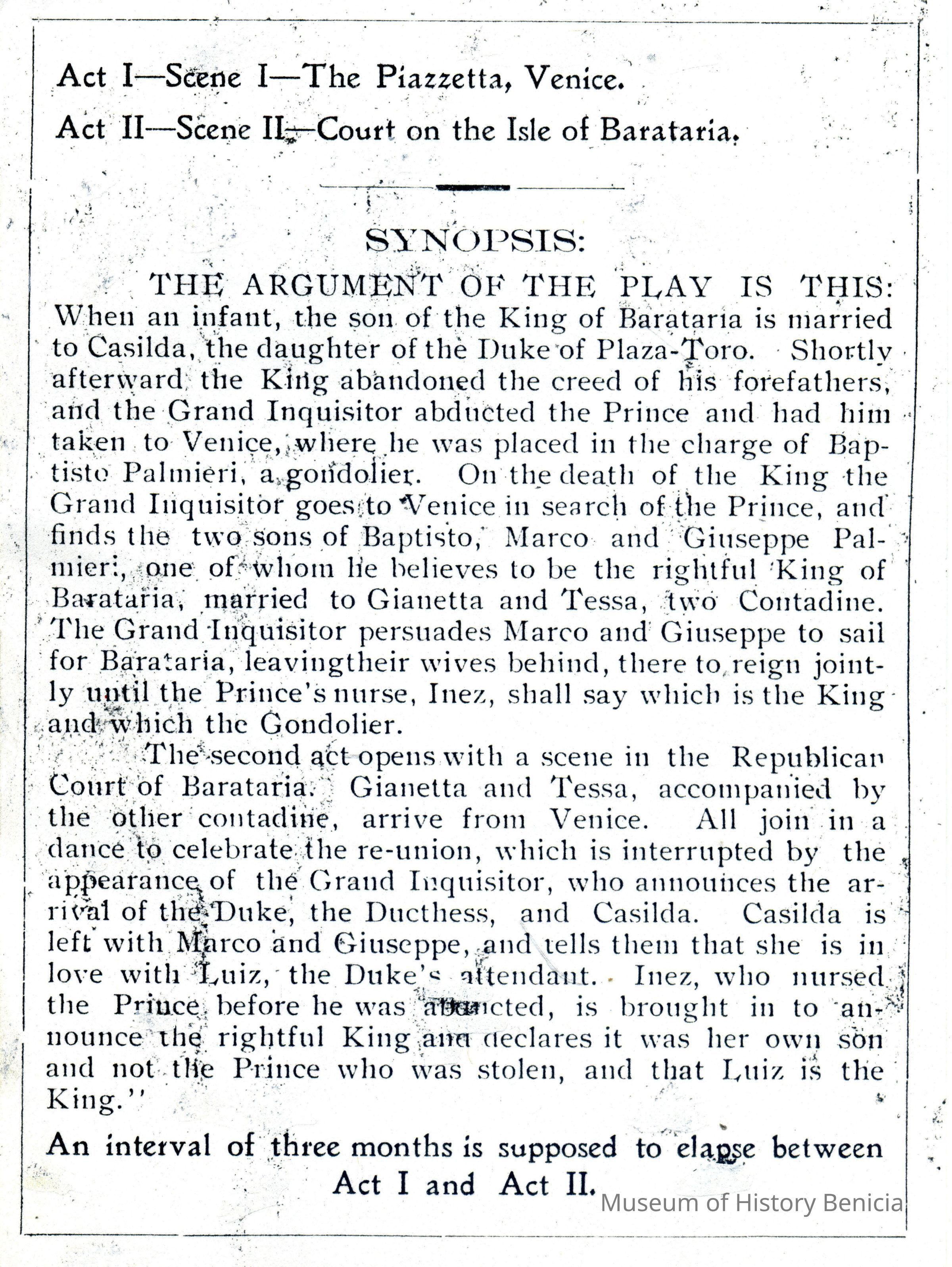 "The Gondoliers"; or, "The King of Barataria" a Savoy Opera, with music by Arthur Sullivan and libretto by W. S. Gilbert. It premiered at the Savoy Theatre on 7 December 1889 and ran for a very successful 554 performances, closing on 30 June 1891.