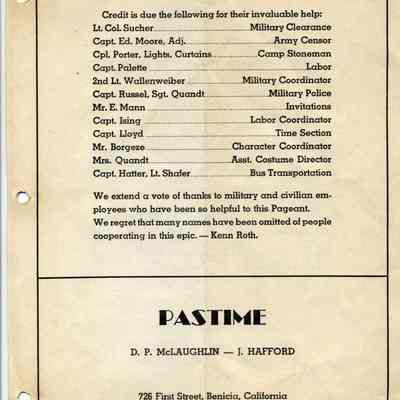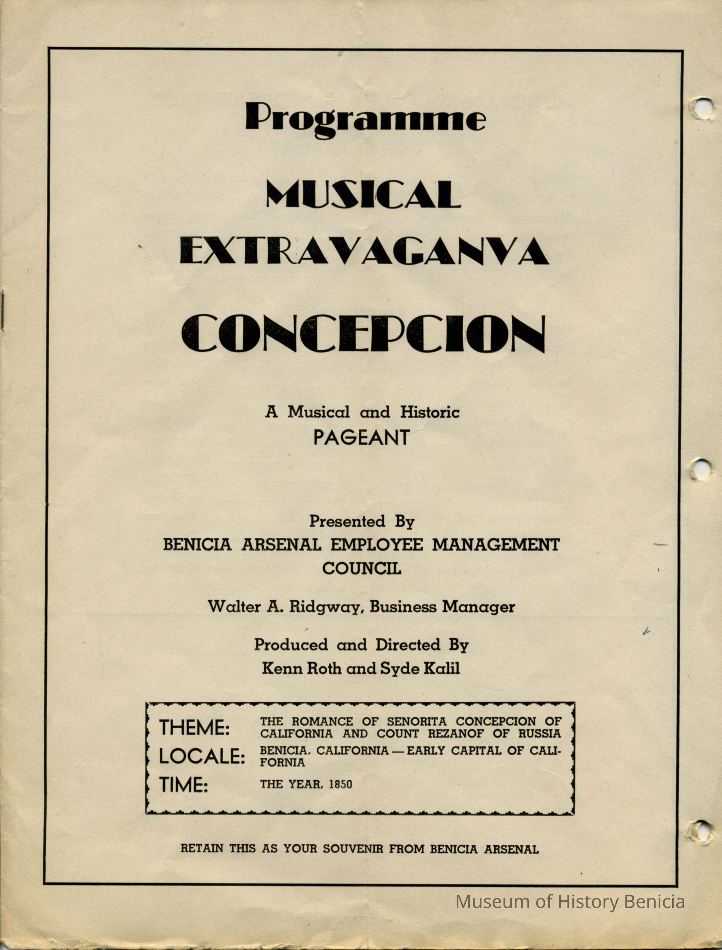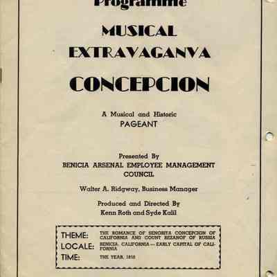 This is a program for a musical "Extravaganza" on Concepcion. It was presented by the Benicia Arsenal Employee Management Council . Not sure of the date. Wilson & Wilson and Spenger's both have ads in the program.Collection