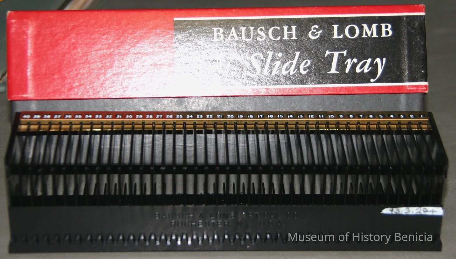Baush & Lomb slide tray black and gold with white numbers on it. Held in red white and black box with Baush & lomb on the side.