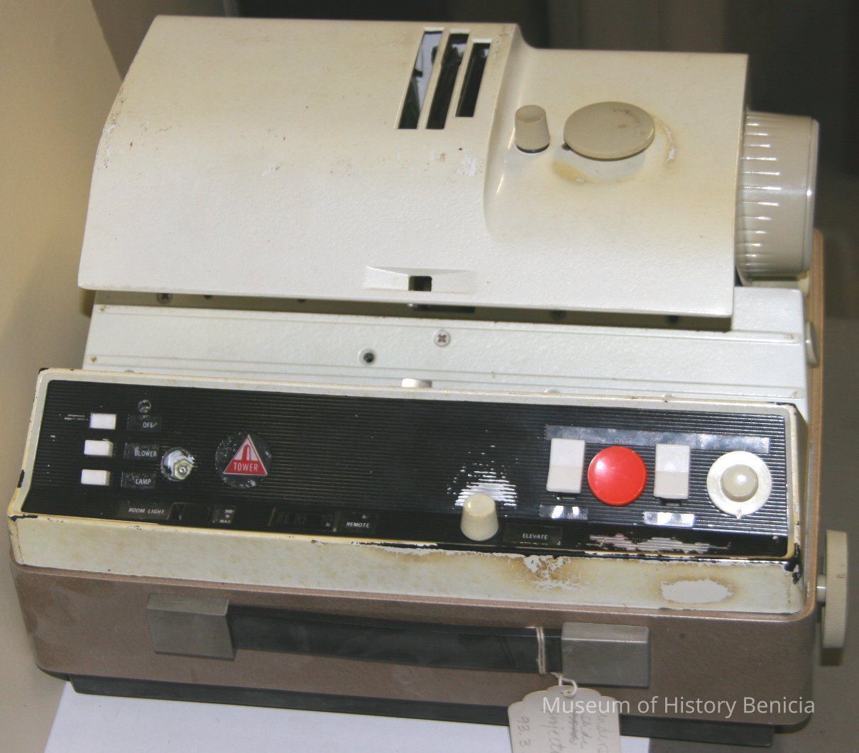 Sears & Roebuck slide projector with plastic case. #9880 Tower projector. model 804.7201531. Contained slide tray with slides in it. The slides accessioned under photographs.Collection