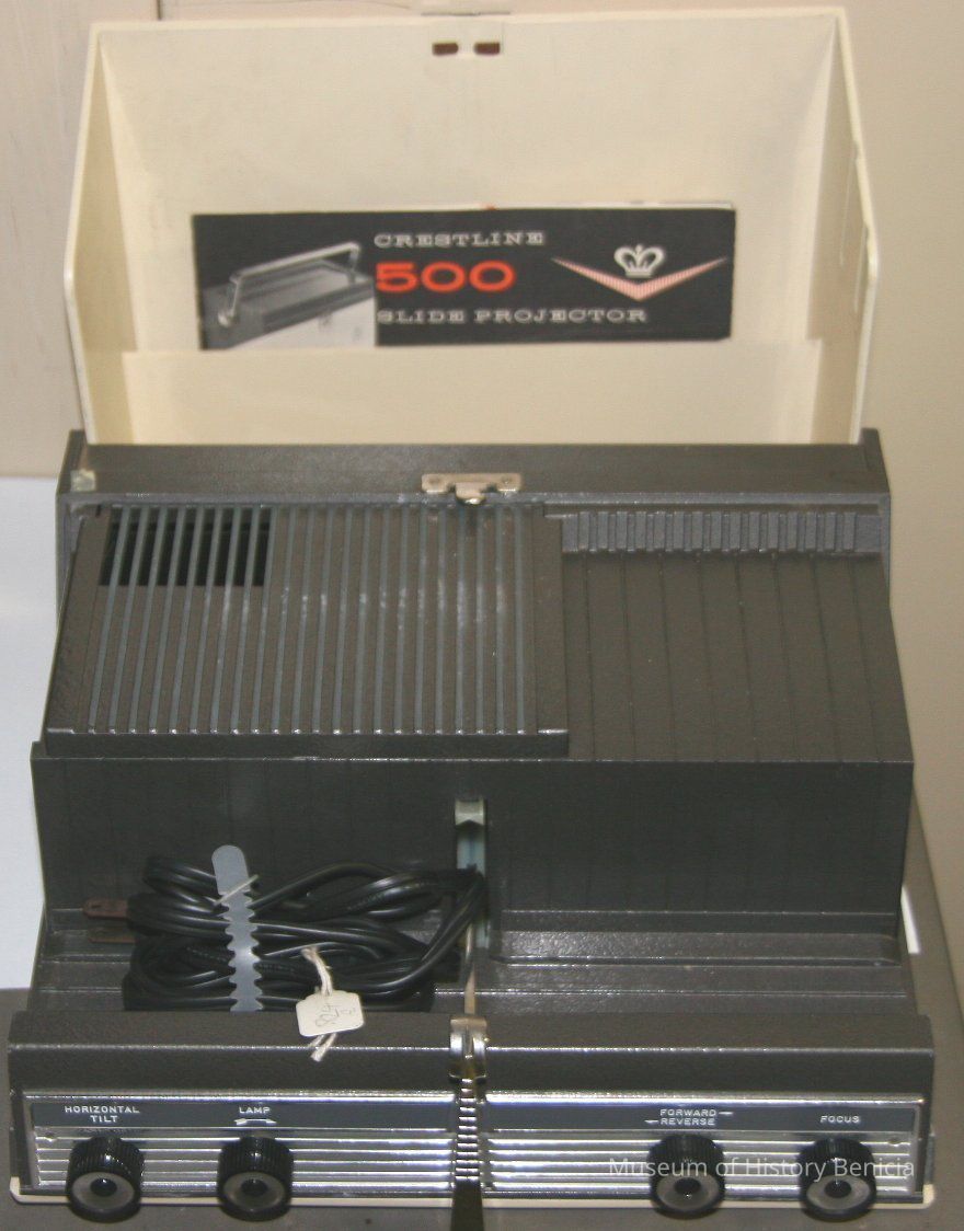 Crestline Deluxe slide projector by Sawyers Inc. Has an f3,5 4 inch lens. Tan and brown cover with instruction booklette. Uses "easy-edit" trays. Inventory sheet 824E says this is not part of the collection per Barbara Mathews 11/12/1992.Collection
