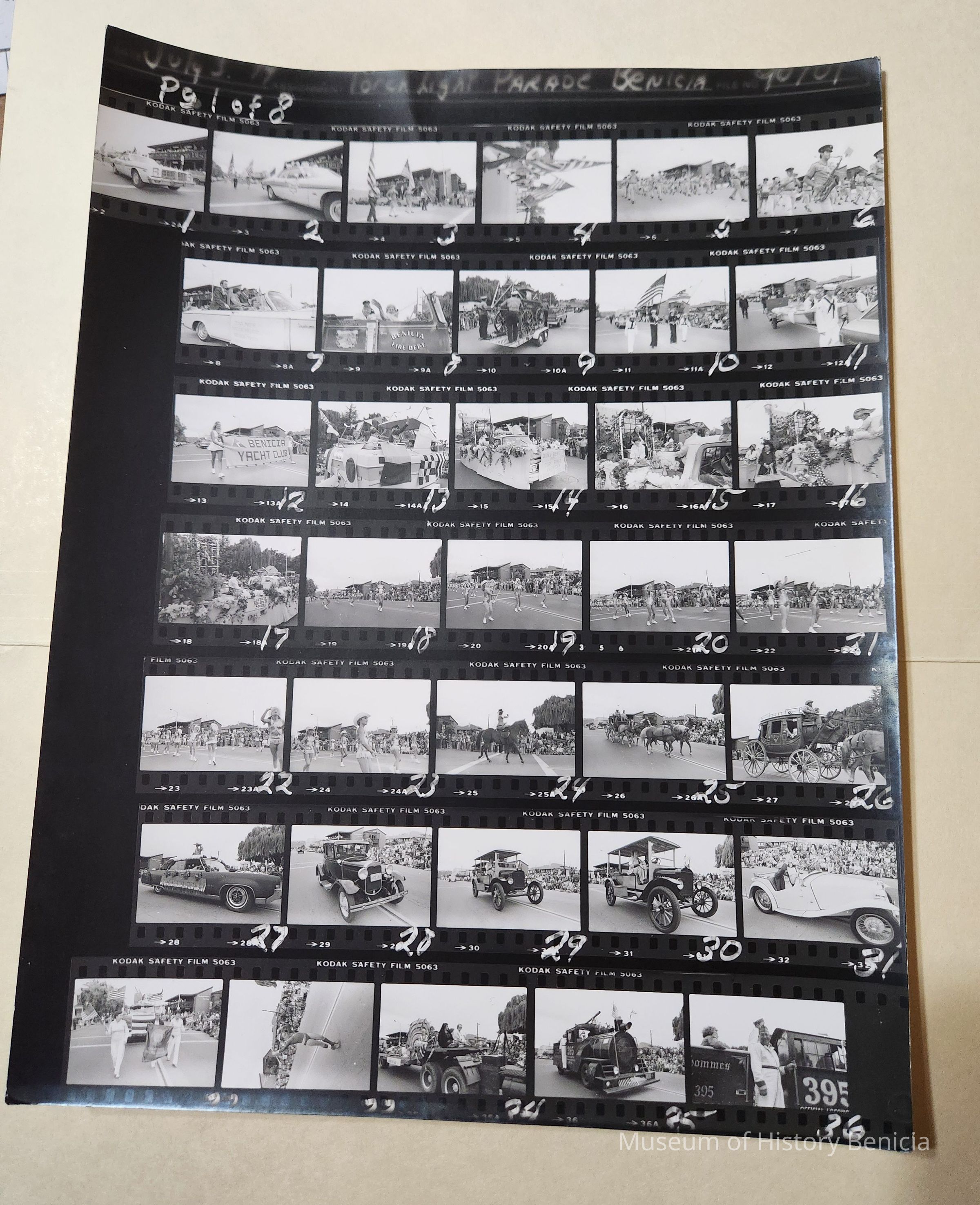Proof page 1 of 8 of B/W photographs from the 1979 Third of July Torch Light Parade and First Annual Sister City Celebration. Photos include: marching groups, majorettes, "Floats", dignitaries in cars, people on horseback, etc.Photograph Details