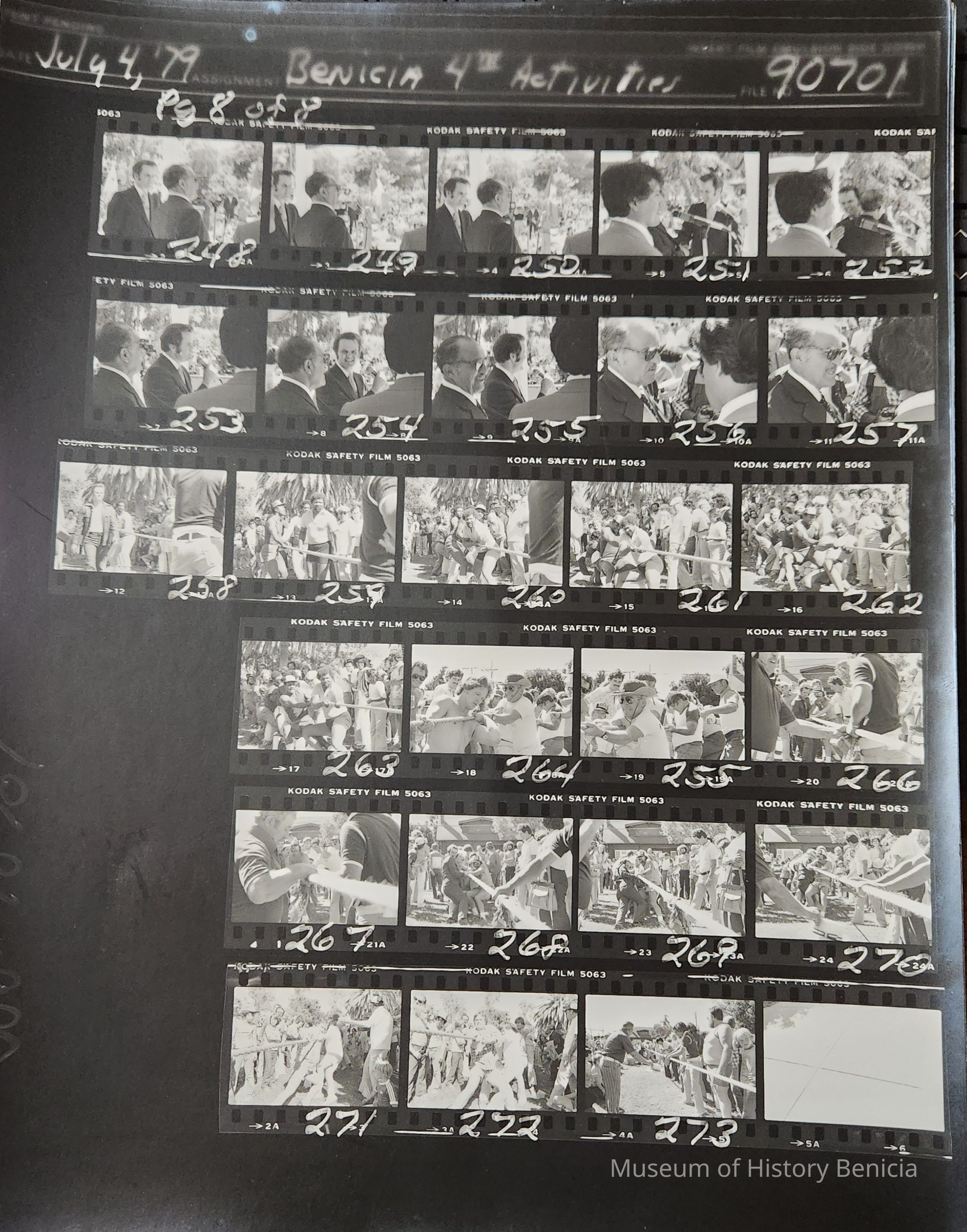 Proof page 8/8 of B/W Photographs from 1979 4th of July activities. Photos include: dignitaries are the park gazebo and tug-of-war in the park.Photograph Details