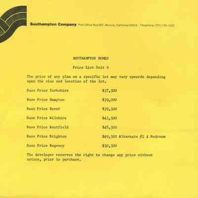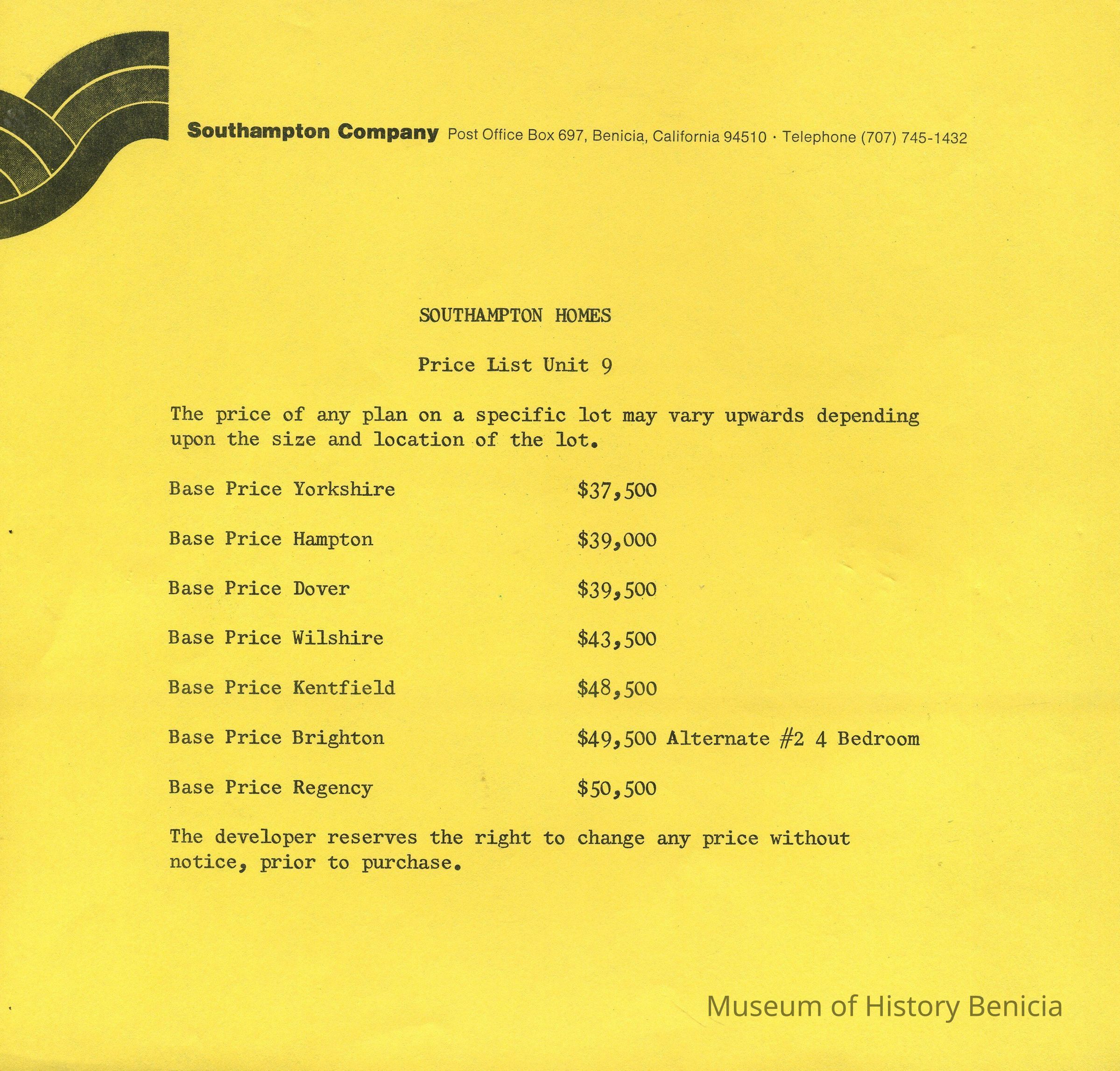 1. Price list Unite 9 - Southampton Homes; range from $37,500