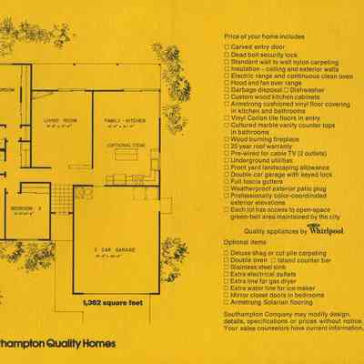 design on front; indoor floor plans on back mustard color
