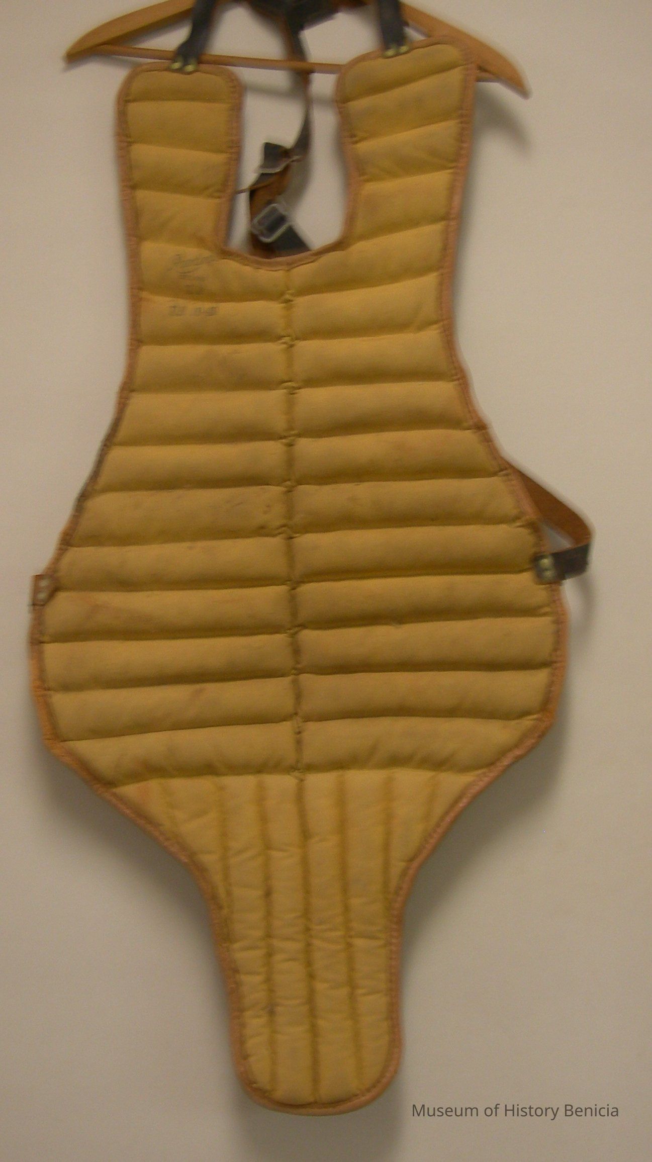 Baseball Catcher's Chest Protector - belonged to Joseph "Winks" Gando of the Benicia Old Timers Baseball Team; tan with brown leather around edge, black straps to secure protector around person's back; includes flap for groin protection;