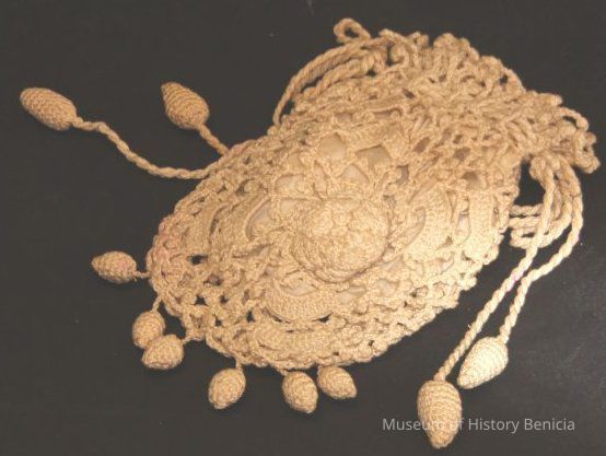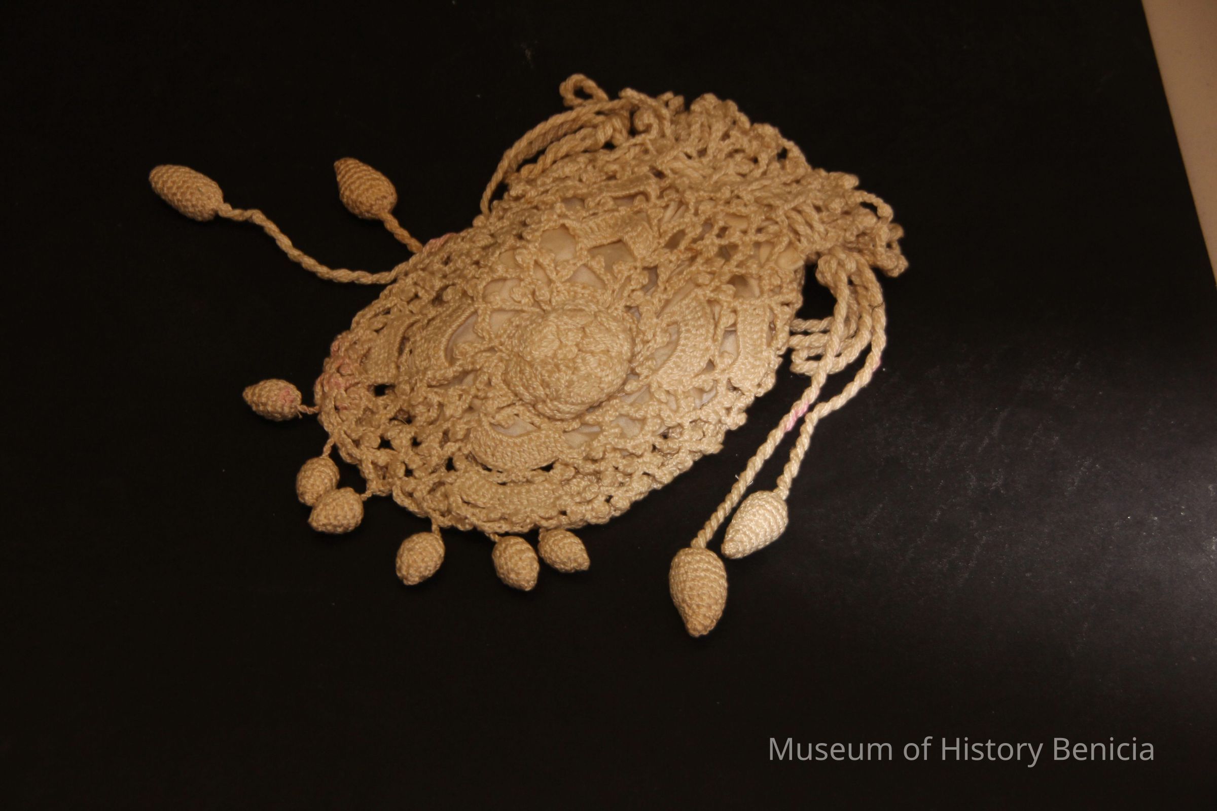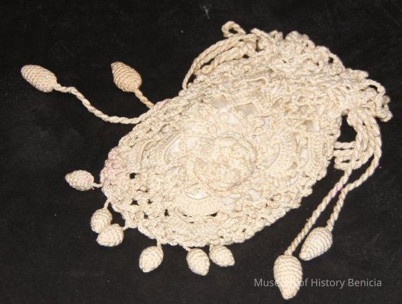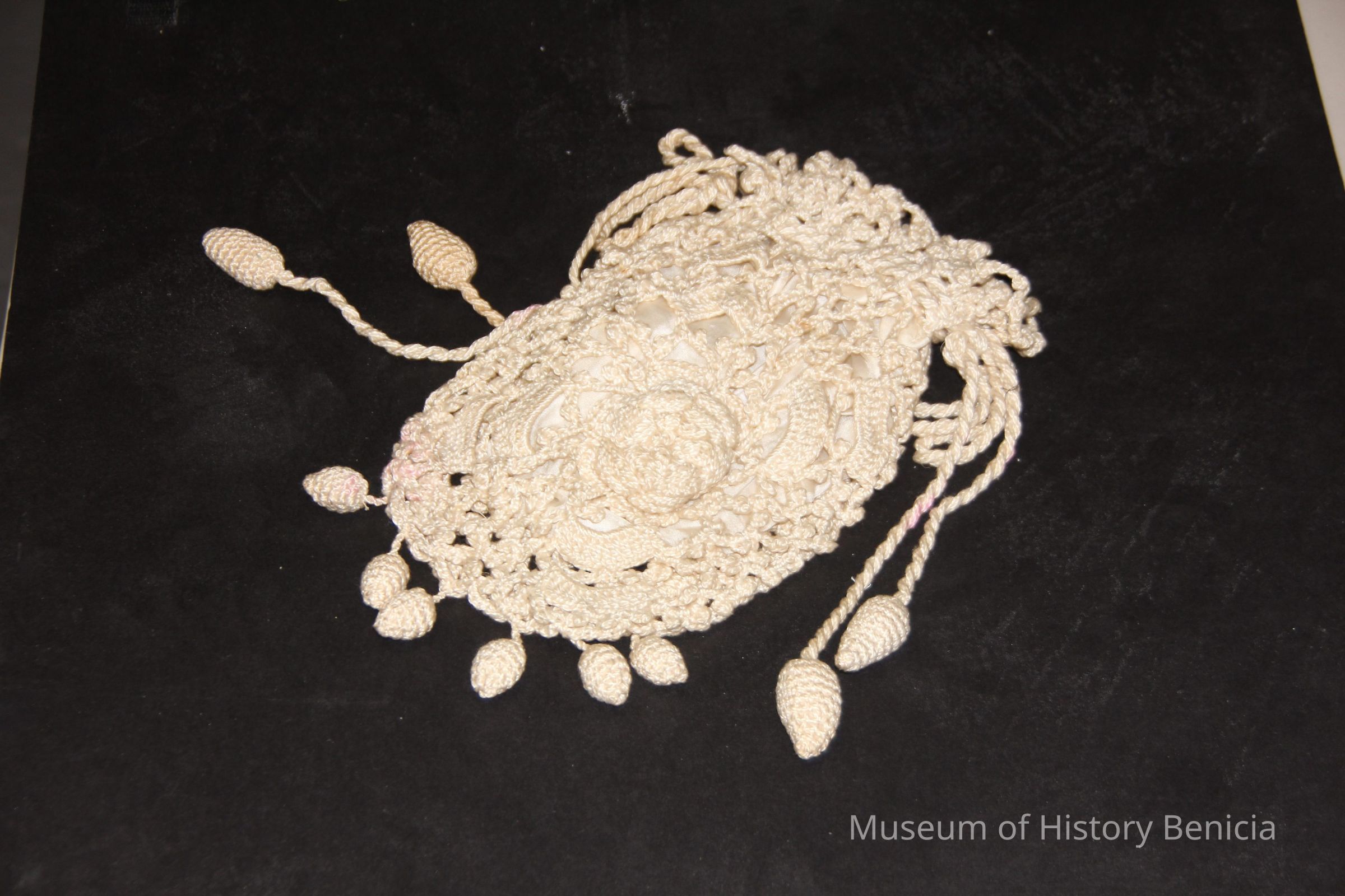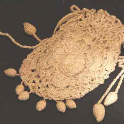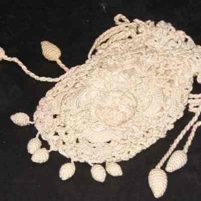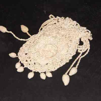 Lined pull string pouch purse - ivory - crochetted with fabric inner bag. Large rosettes on either side, stuffed oval balls hang from bottom and from the pull strings, yarn strap.Collection