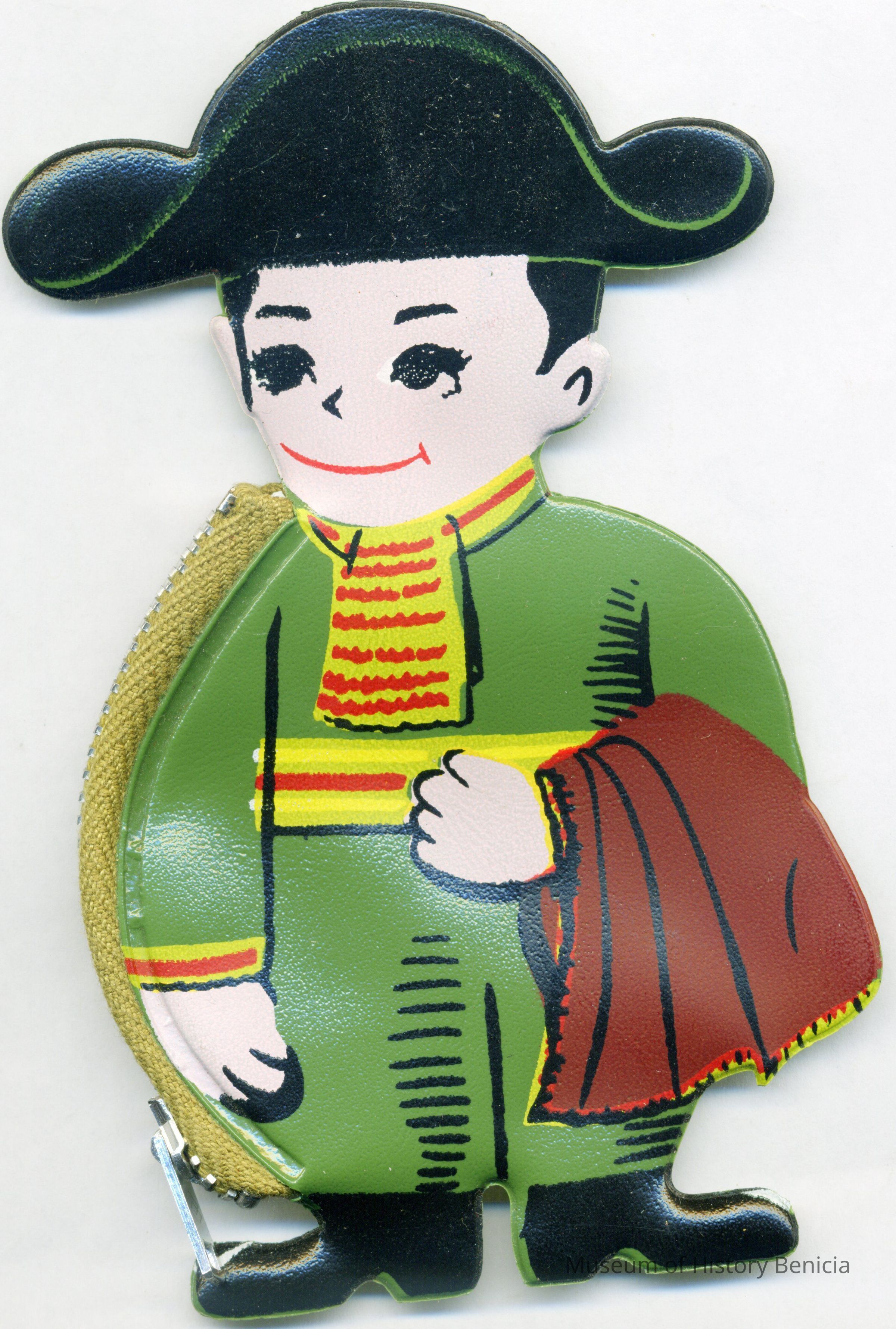 This is a small plastic coin purse made to look like a matador. It has a zipper on the side. The image is only on one side, the other side is solid green. It is 5" x 3".