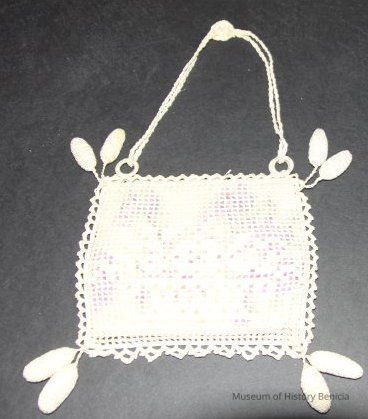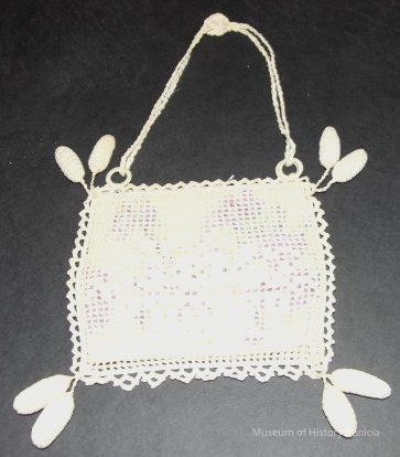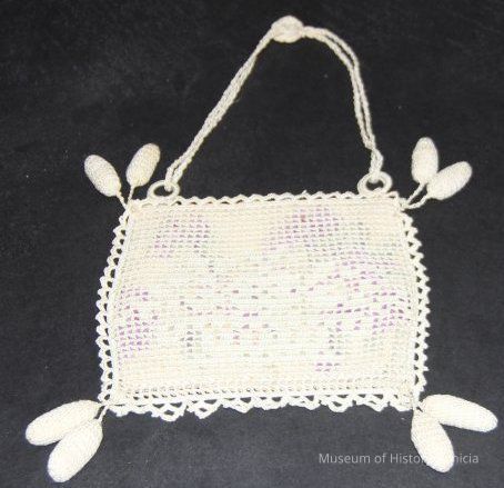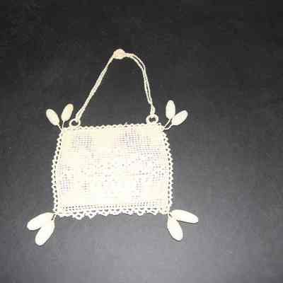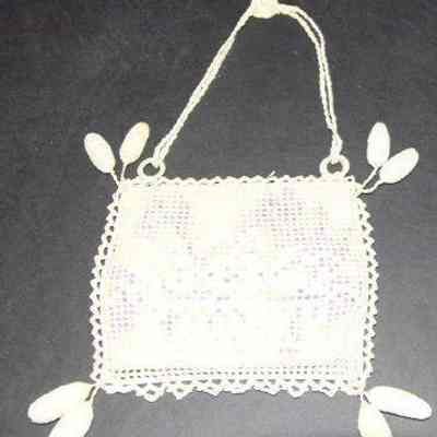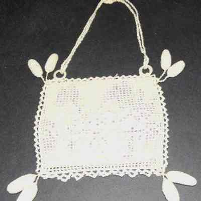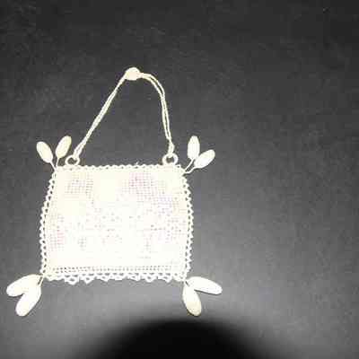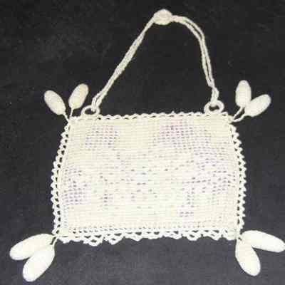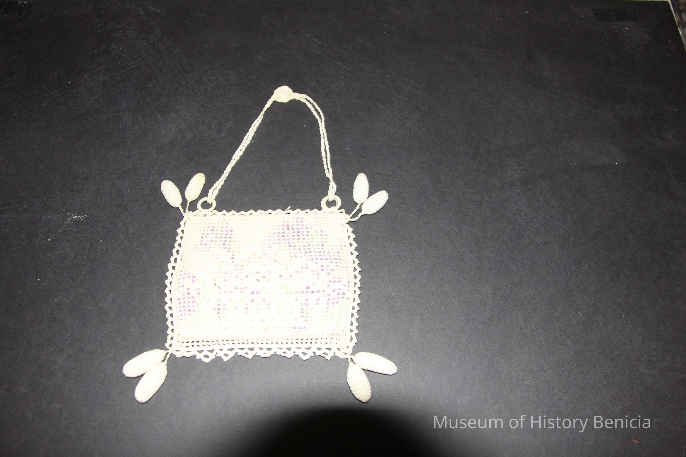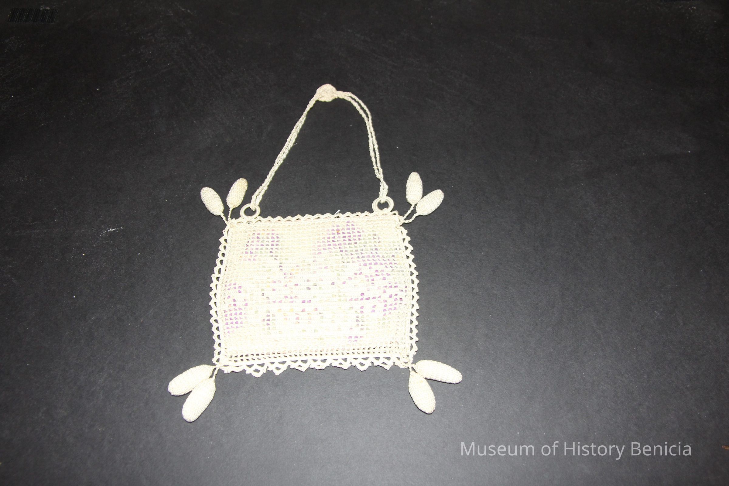 Needlework purse, square, flowered fabric inset, two stuffed oval balls hang off each corner, double strap has rosette at apex. # 93.44.18 fits inside.