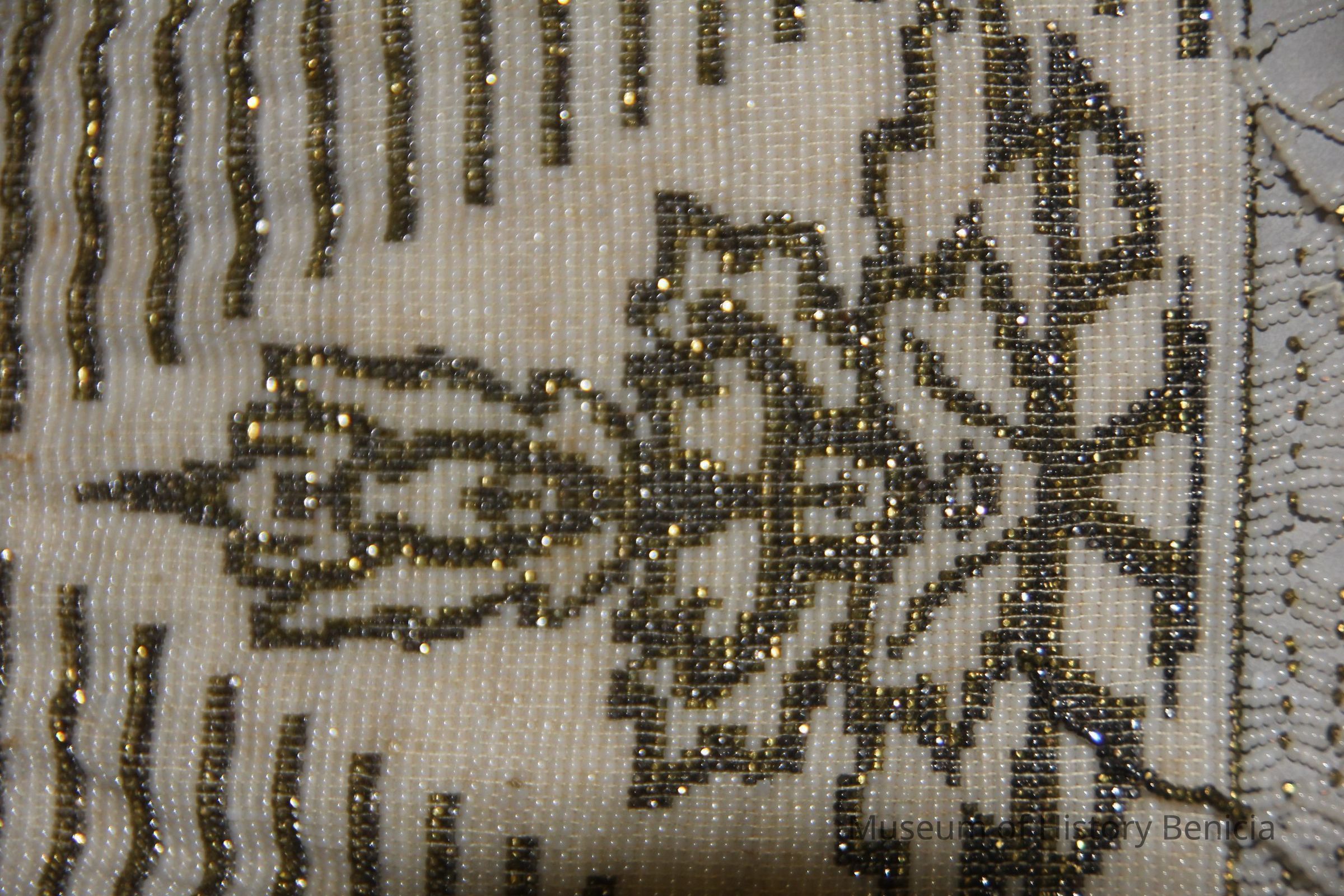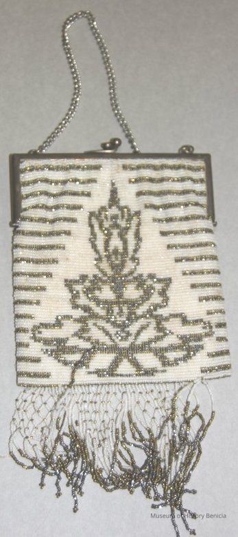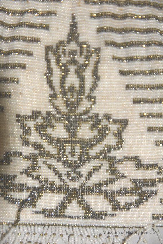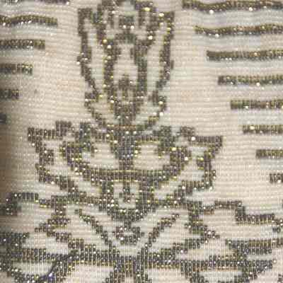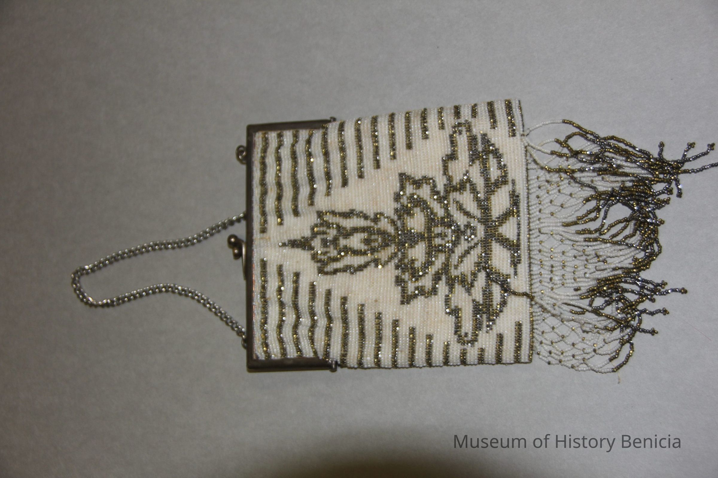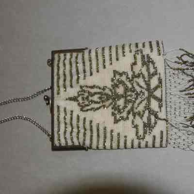 Rectangular beaded purse, white background with silver & gold design and stripes white, silver & gold bead fringe hangs from bottom, silver snap with clasp and chain.
