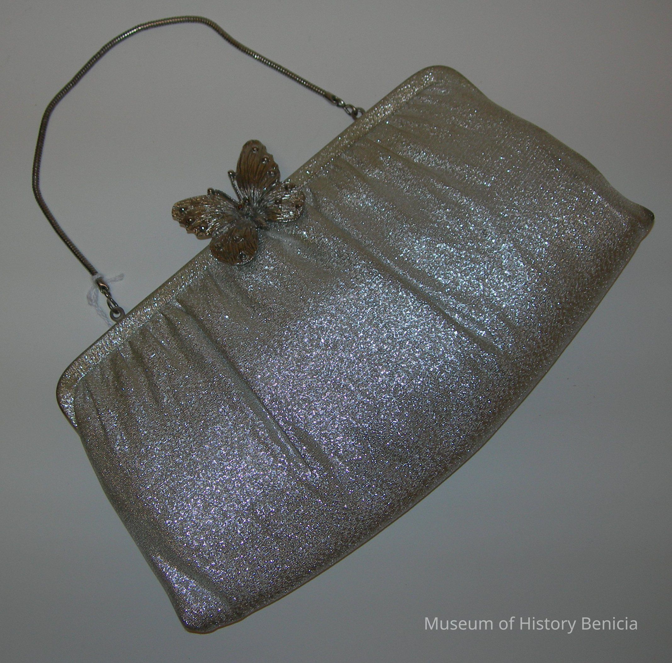 Silver/metalic cloth purse with silver butterfly clasp. Beige satin lining with small pocket on one side (inside). Tightly woven silver chain handle. Chain handle slides through loops for carrying on arm or over the shoulder.Collection