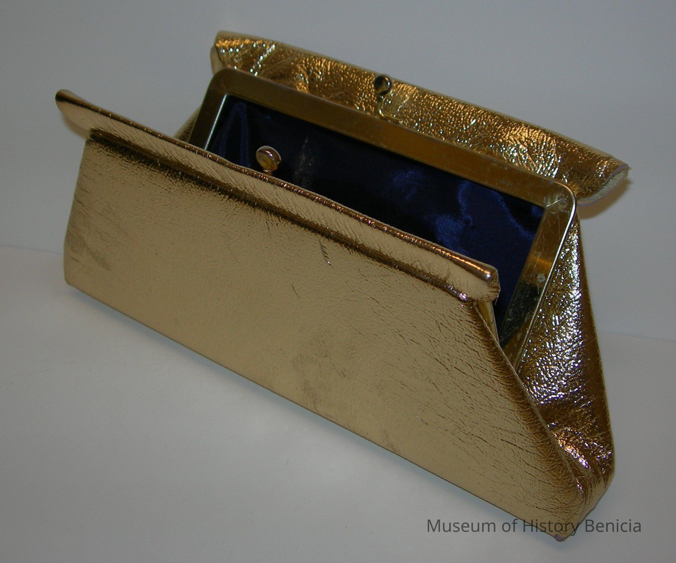 stiff gold vinyl triangular clutch purse with blue satin lining