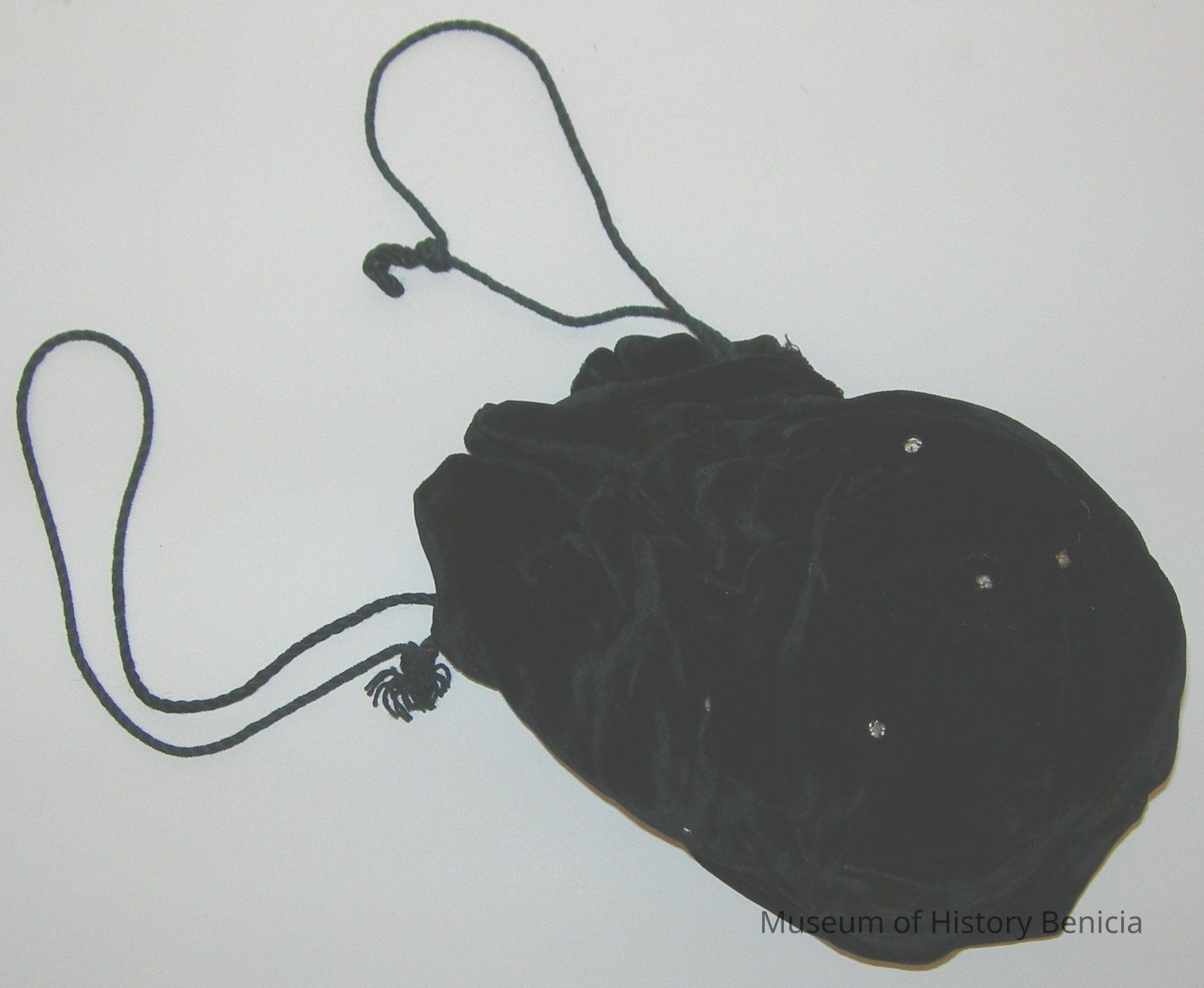 Black, velvet drawstring purse studded with rhinestones, evening bag; black cloth lining