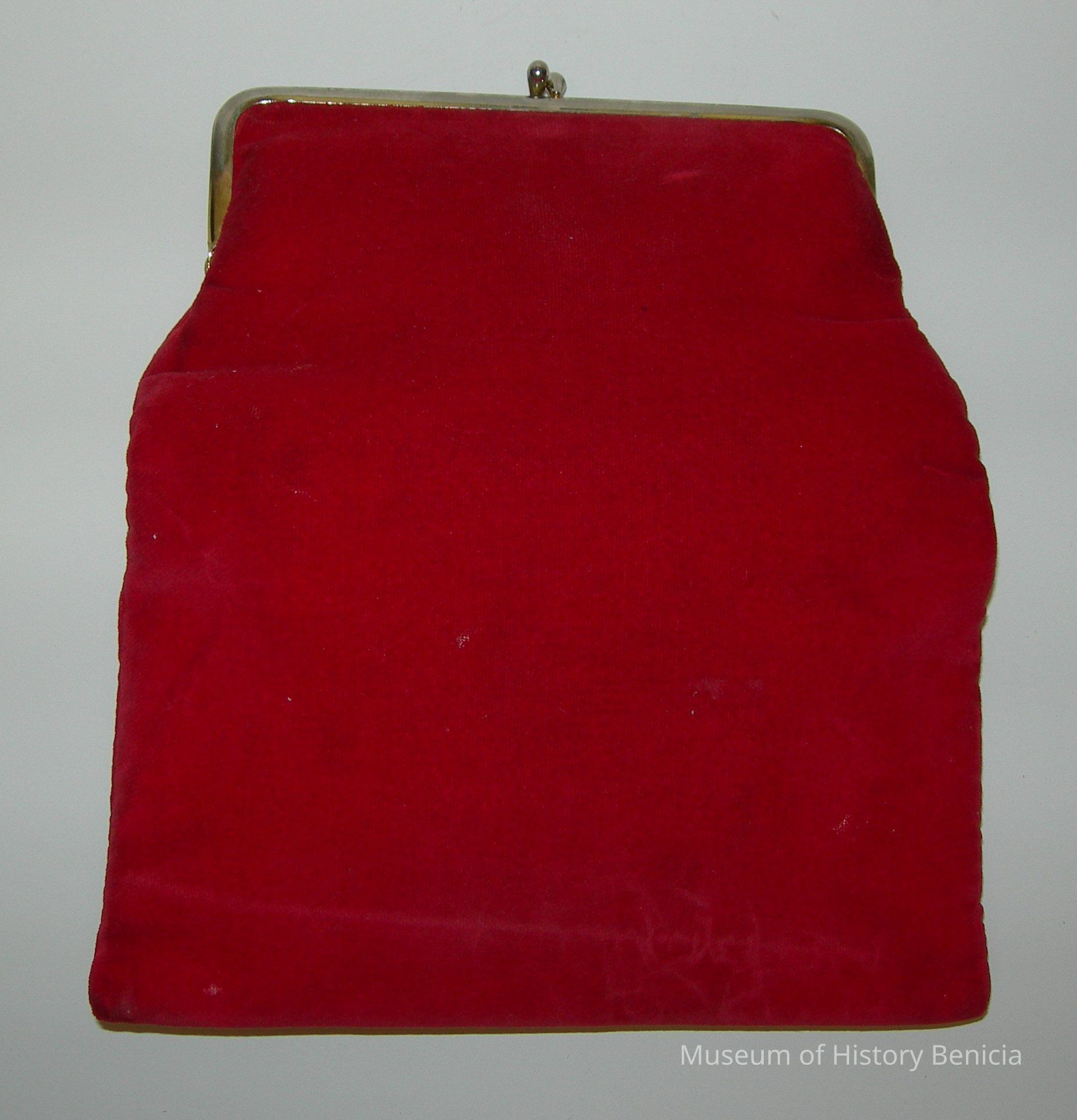 Red velvet clutch purse with (rainbow) striped interior; gold metal clasp