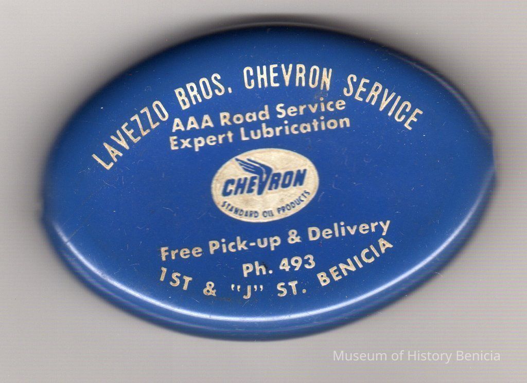 Plastic, blue coin purse from Lavezzo Bros. Chevron Service located at First and J Streets, Benicia, CA