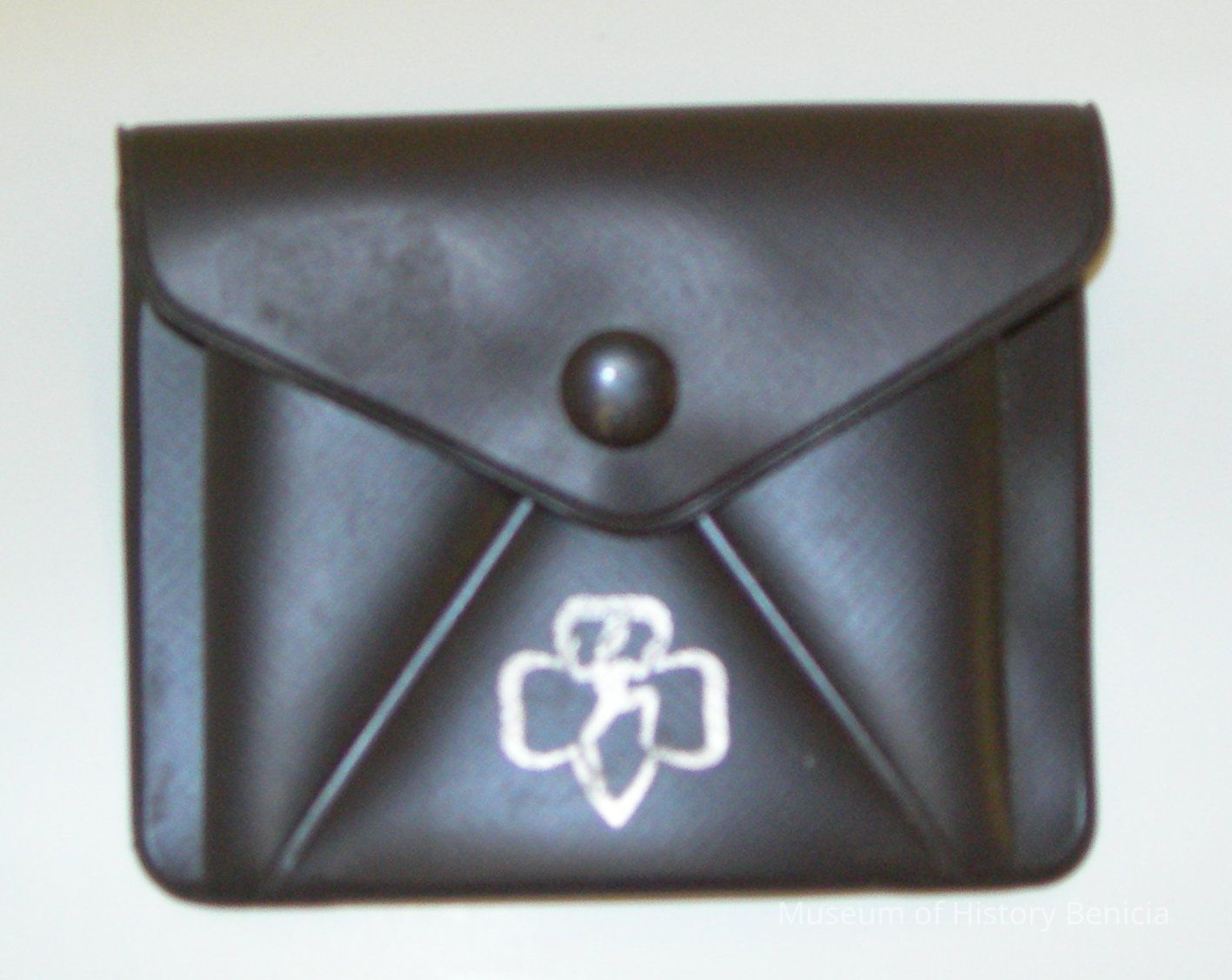 small, brown, vinyl/plastic coin purse with a belt loop; Girl Scout emblem printed in gold; single snap closure