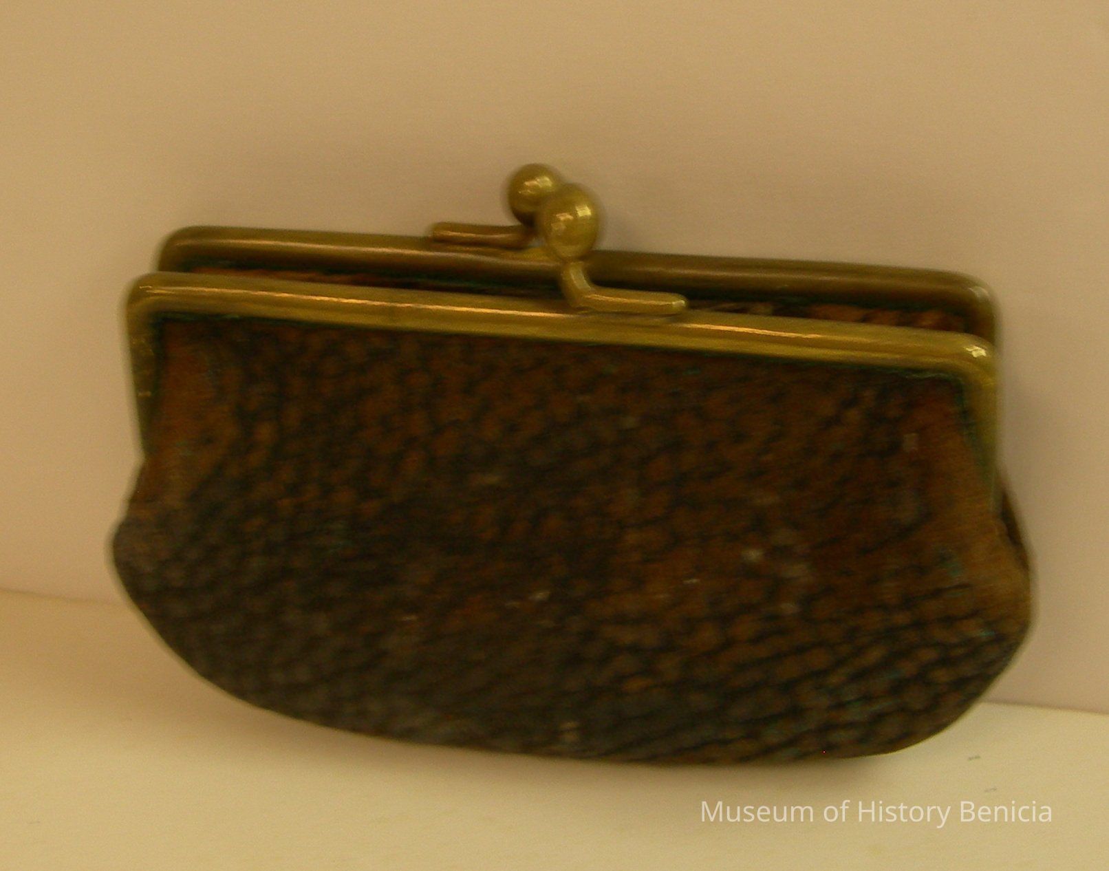 Rounded, rectangle with brass clasp; black leather with leather lining;