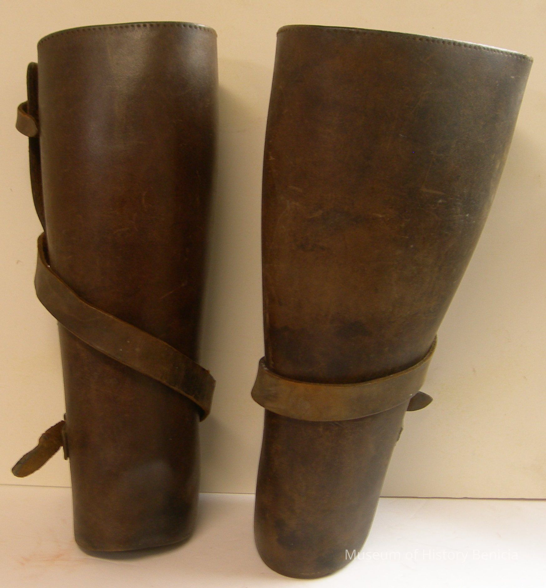 WWI heavy, stiff leather shin guards aka Puttees leggings, two straps with buckles to hold in place on lower leg; 12" long x 17" wide;