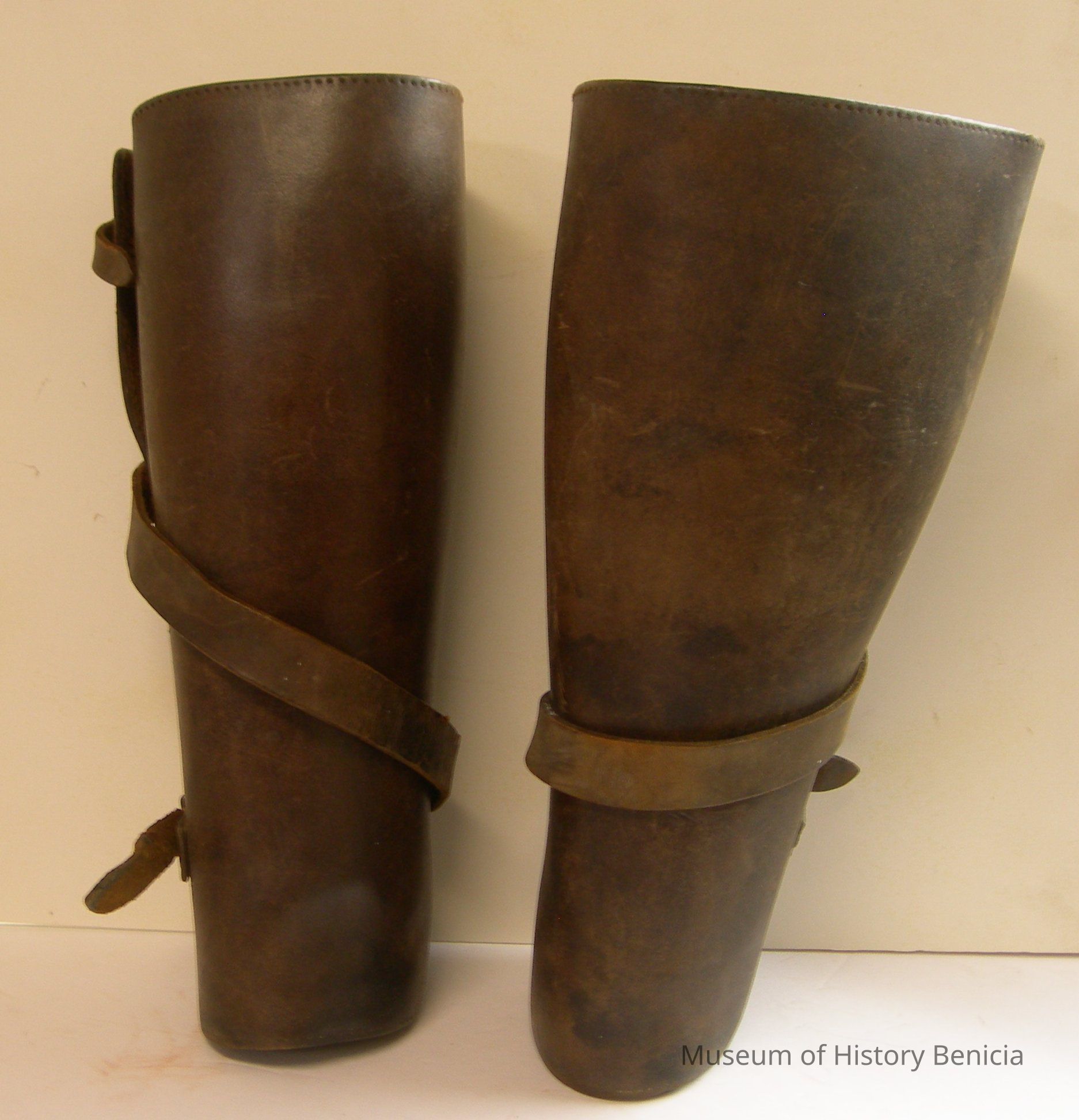 WWI heavy, stiff leather shin guards aka Puttees leggings, two straps with buckles to hold in place on lower leg; 12" long x 17" wide;