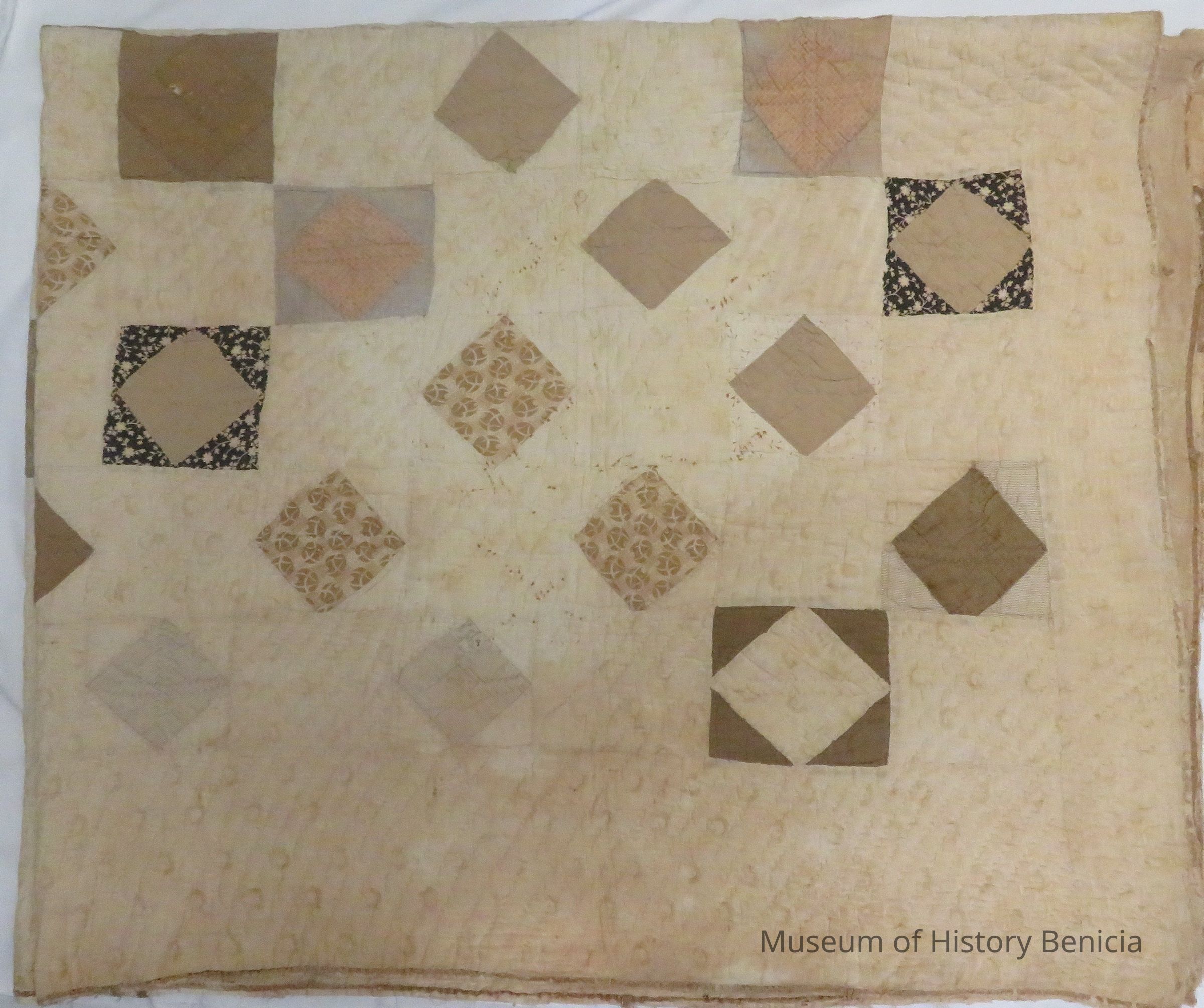 Quilt with squares and triangles in pattern in brown and tan. Measured at 76" x 62".