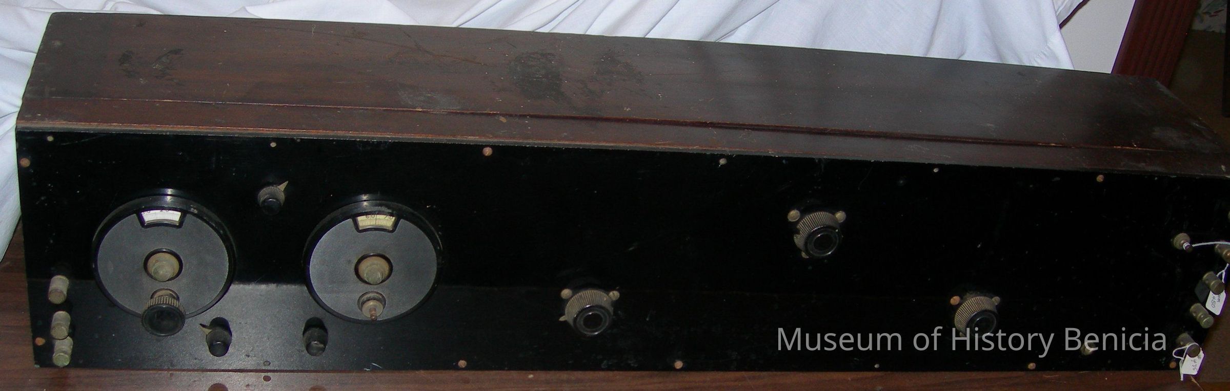 many knobs on front, along with connections for wires, hinged lid lifts to expose innards of tubes, wires, etc.; wood case with plastic (bakelite?) front; unknown if in or near working conditionCollection