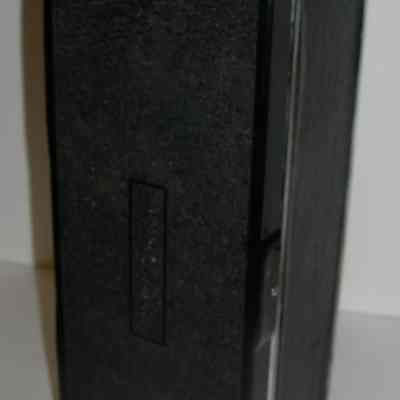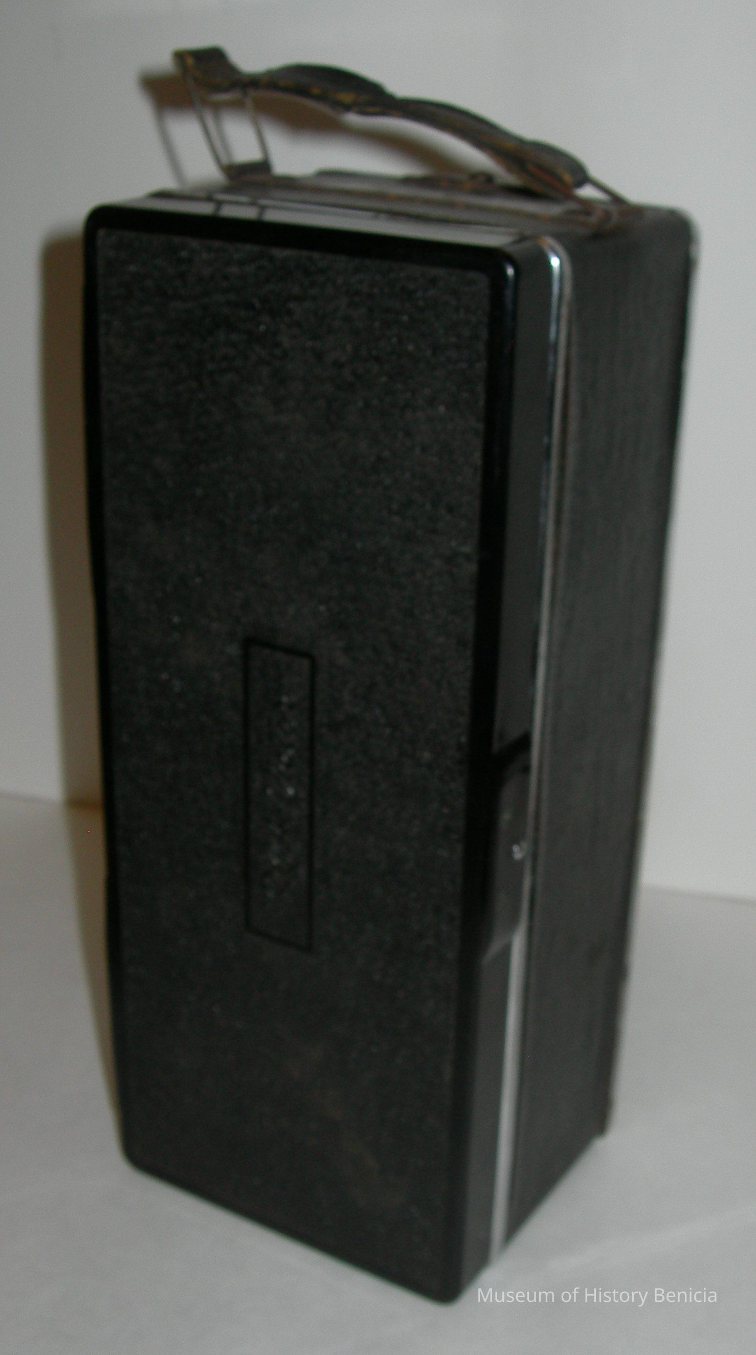 Black box with hinged cover, silver chrome trim on outside, carrying handle on one end