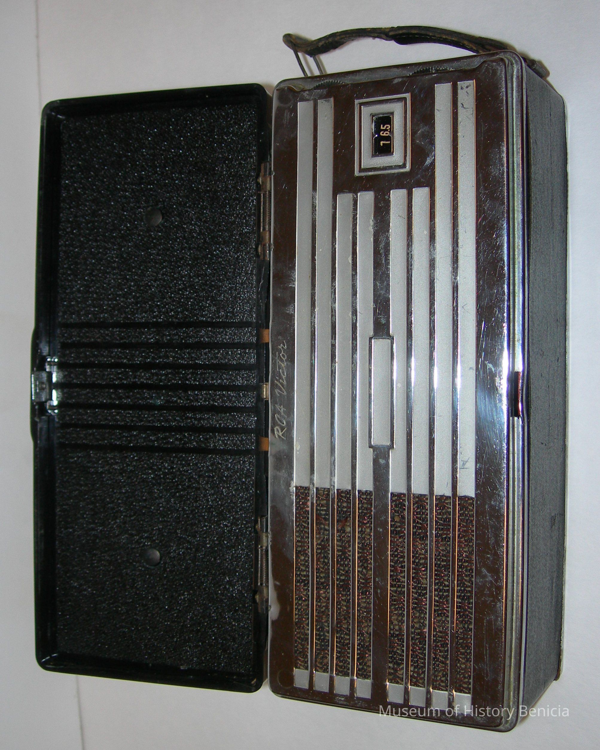 push botton opener on lid; chrome inside with openings for the speaker and station number, dials are on the side