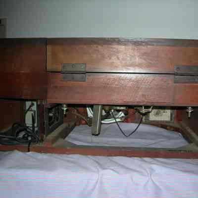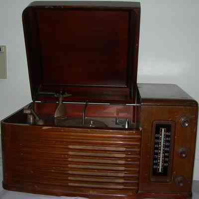 hinged section of top lifts up to reveal 78 rpm record player;