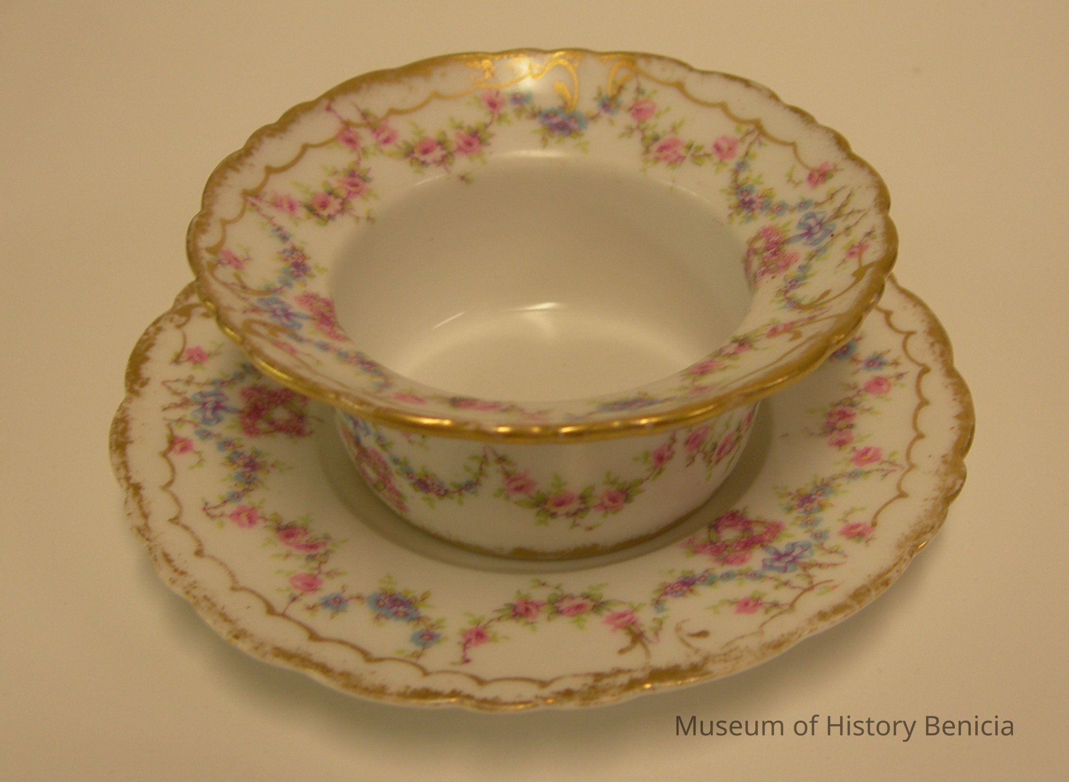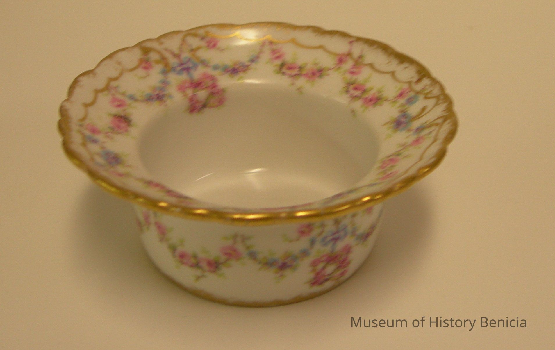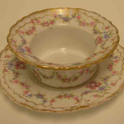 white background with gold on the rim and around the bottom edge; scallops of gold and swags of blue and pink flowers decorate all around the flared rim and also all around the sides of the ramekin; hand painted but pattern name is unidentified.