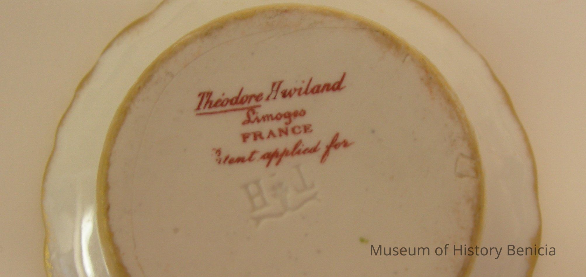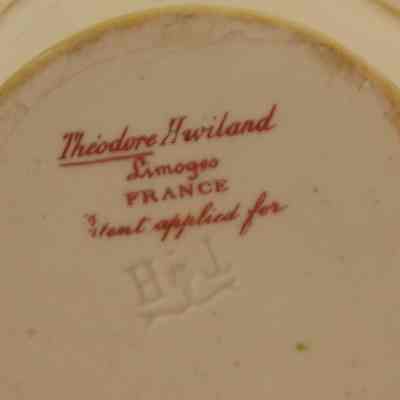 Porcelain ramekin, which is a mate for a saucer, it has a maker's mark on the bottom: "Theodore Haviland Limoges FRANCE Patent applied for"