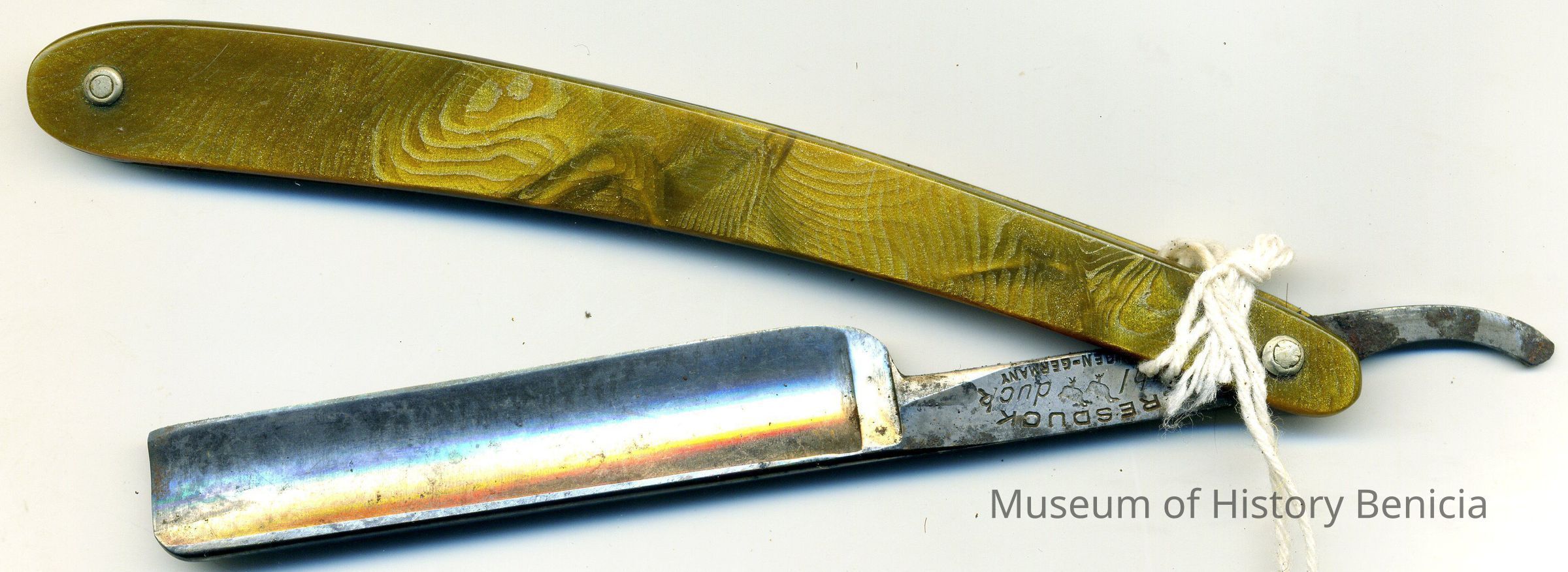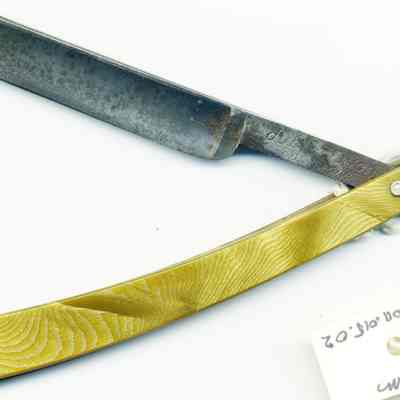 Six inch razor (closed) with a 3 inch blade. Has a green wood grain plastic handle. Called the "Bresduck Dubl Duck" "Satinedge" razor. Mfg in Solingen-GermanyCollection