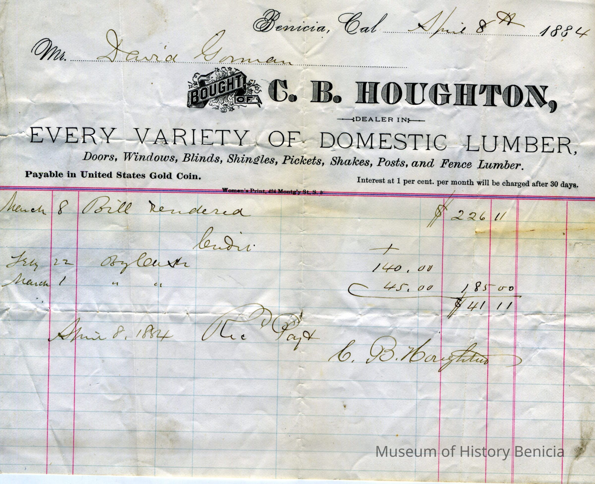 Receipt from C. B. Houghton Lumber Yard to Daria Gorman for work and materials from April 8, 1884.
