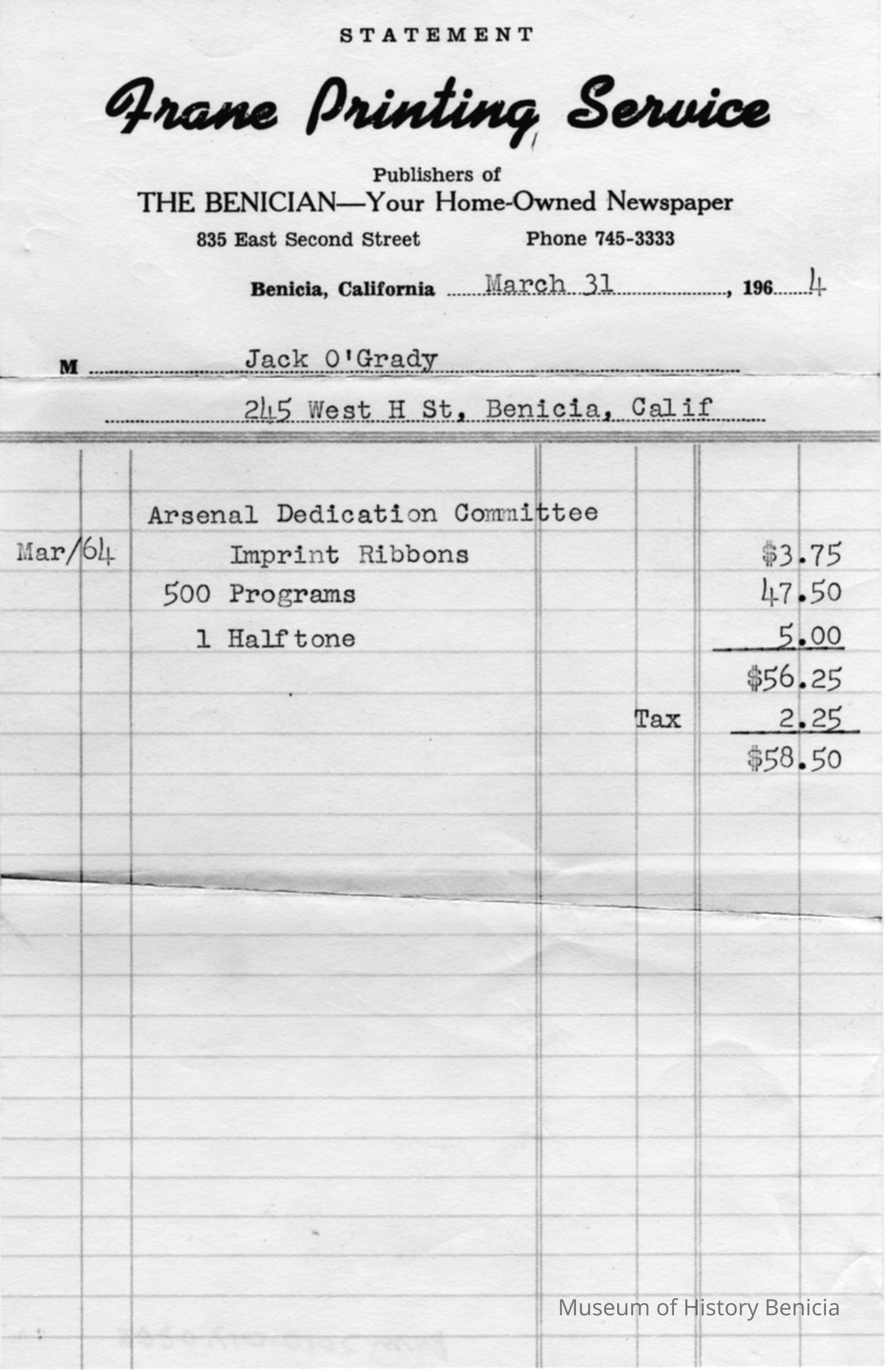 receipt for materials used in Arsenal dedication in 1964.
