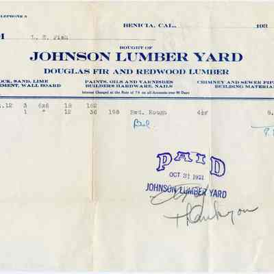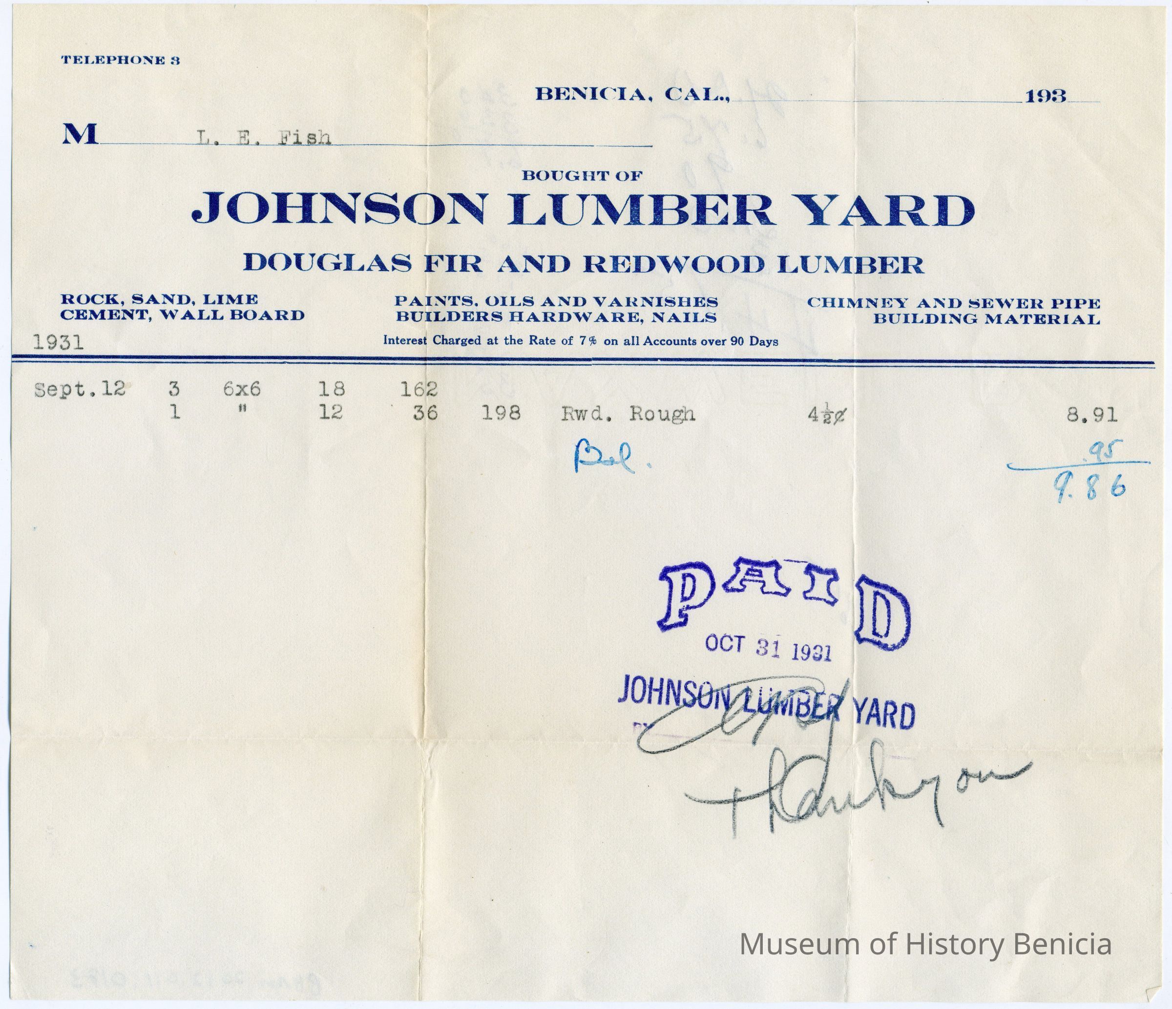 Receipts for wood from Johnson Lumber Yard delivered to L.E. Fish. One receipt is dated 10/31/1931 and the other is dated 02/28/1934.