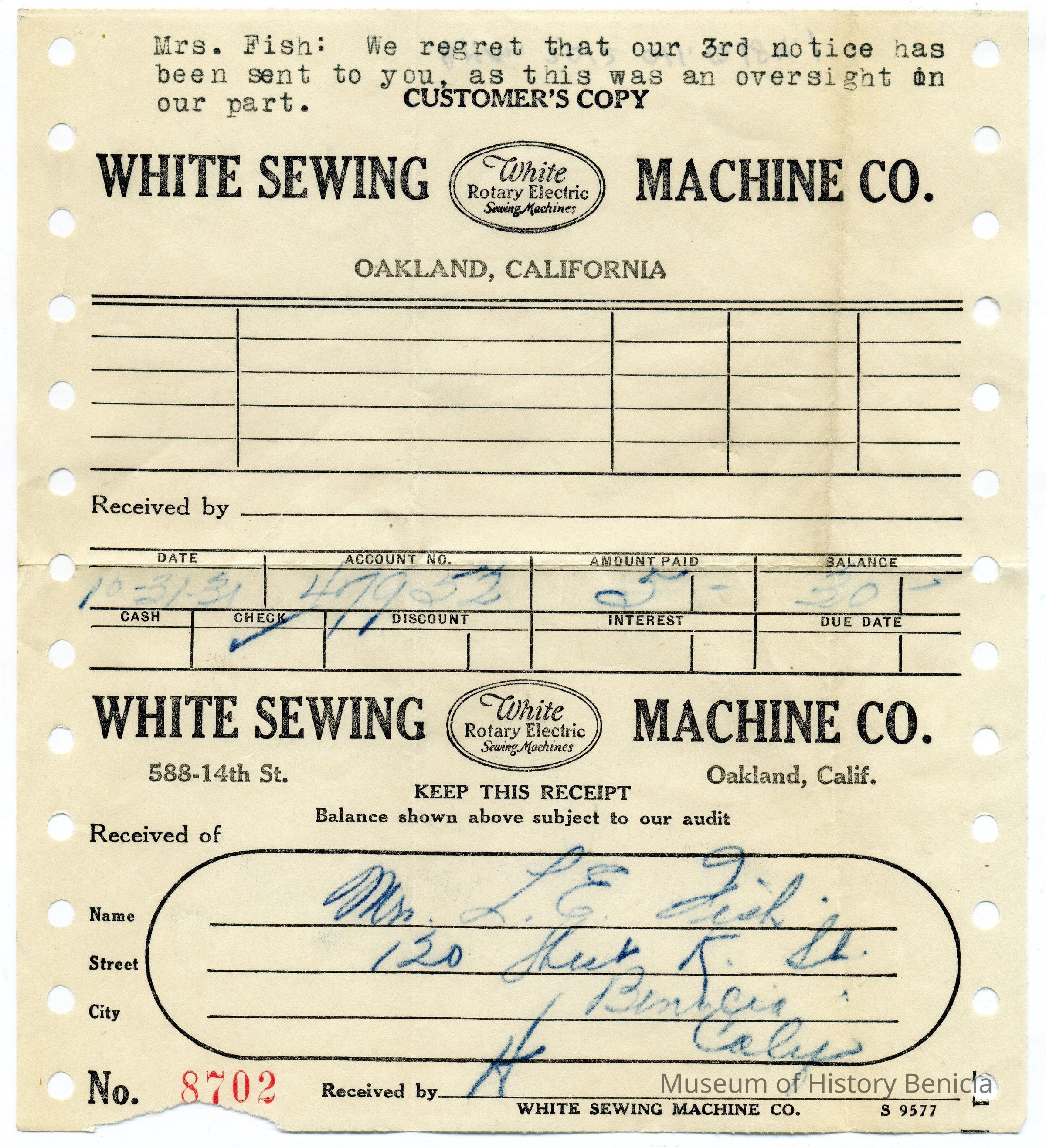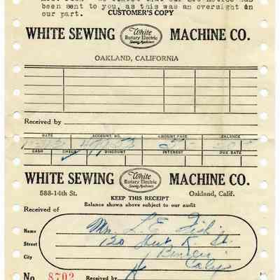 Receipts for Mrs L.E. Fish from the White Sewing Machine Co in Oakland Ca dated 01/08/1929 and 10/321/1931.