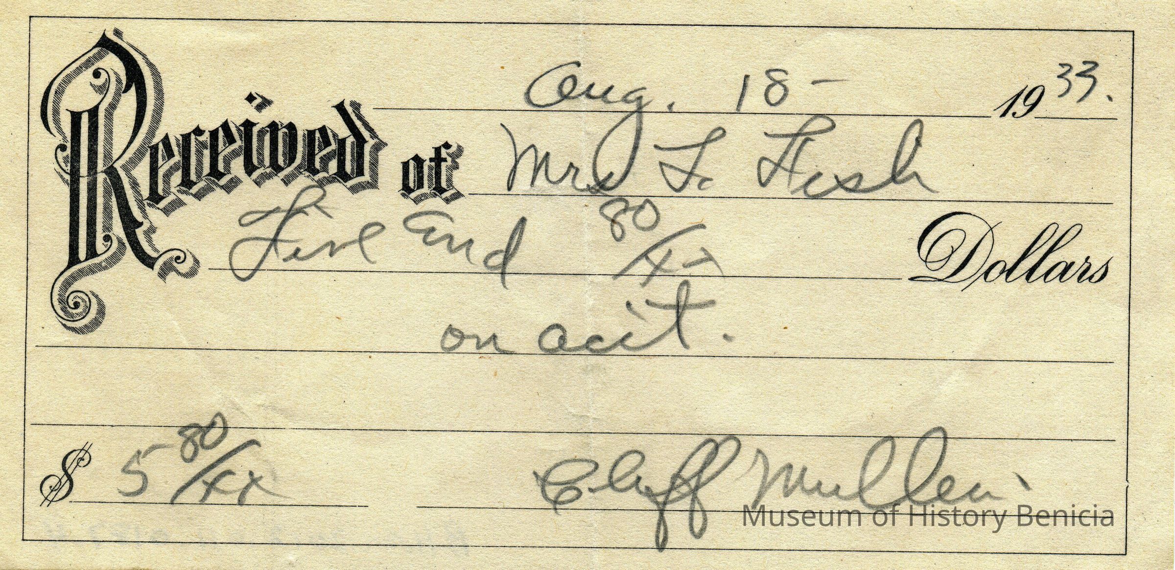 Receipts for Mr & Mrs L.E. Fish from various business/individuals. Sometimes the name of the company is not shown. The receipts range from 1928 to 1933.Collection