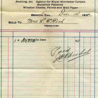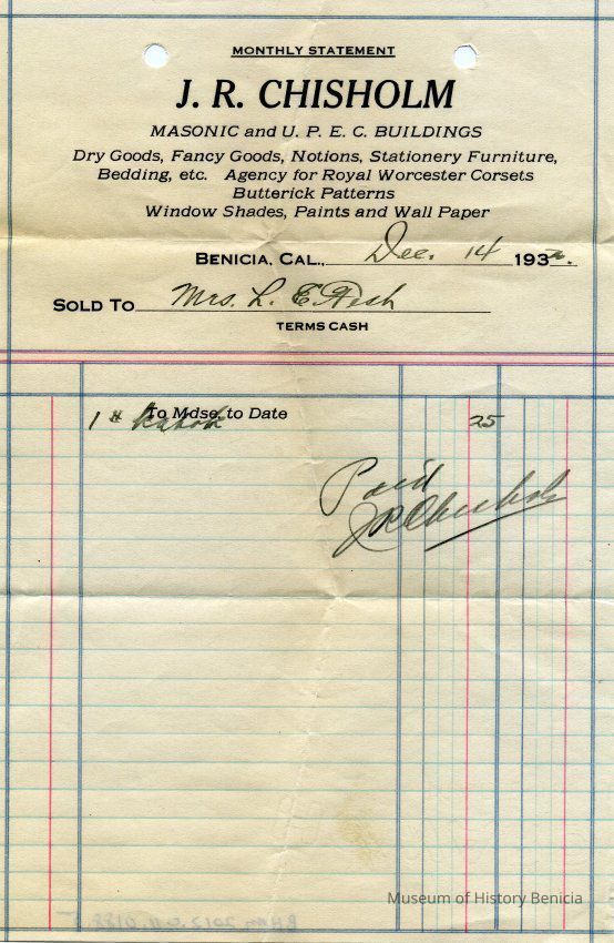 Receipts for Mr & Mrs L.E. Fish from J.R. Chisholm company. They were in the Masonic and U.P.E.C. Buildings in Benicia. The receipts are from 1932 - 1933. The company sold dry goods, window shades, paint, etc.Collection