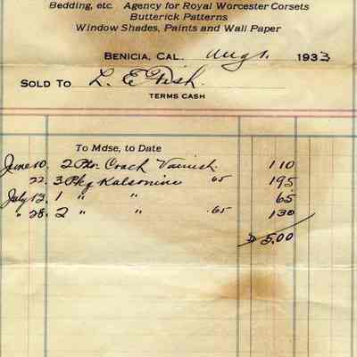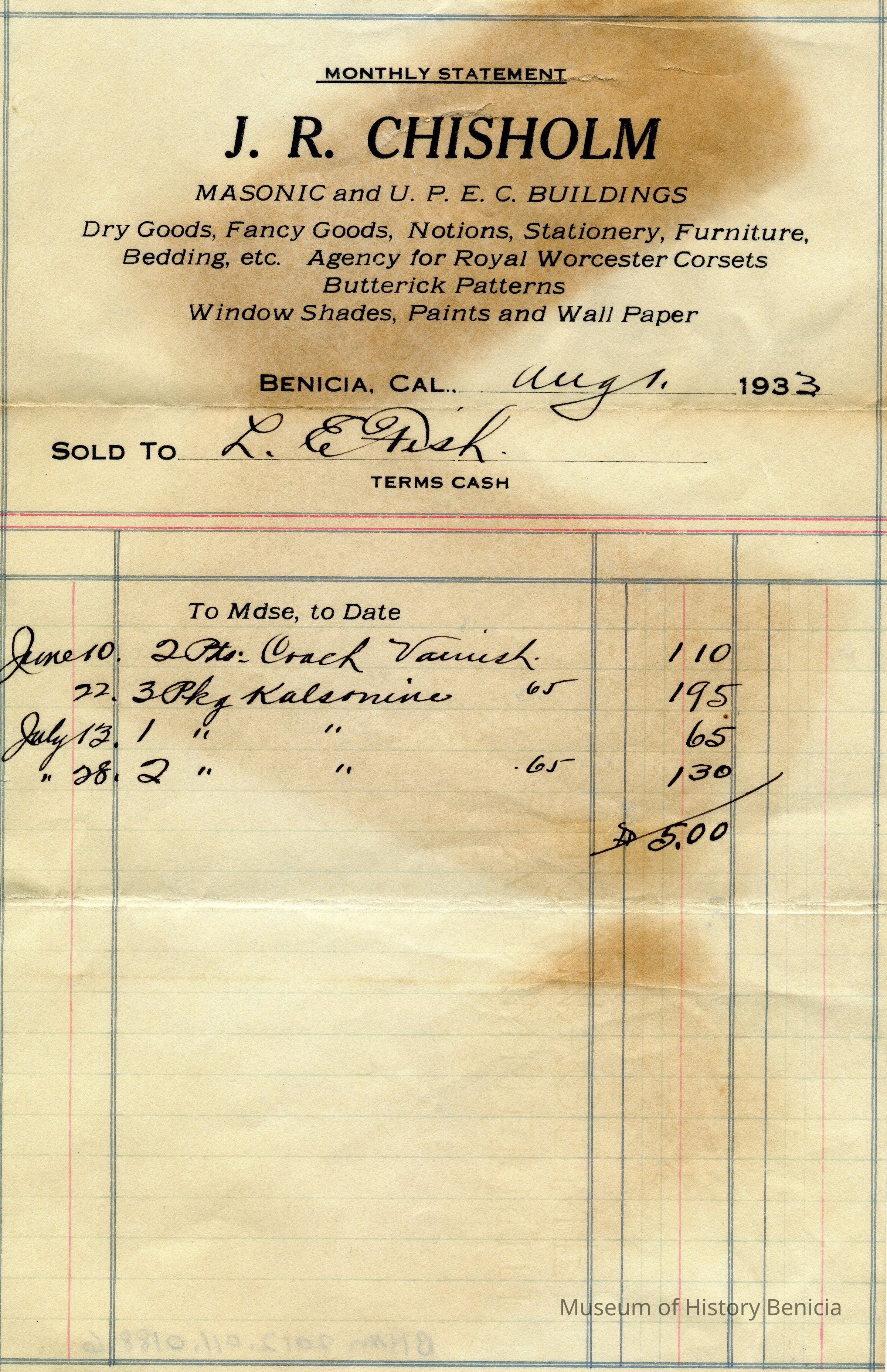 Receipts for Mr & Mrs L.E. Fish from J.R. Chisholm company. They were in the Masonic and U.P.E.C. Buildings in Benicia. The receipts are from 1932 - 1933. The company sold dry goods, window shades, paint, etc.Collection