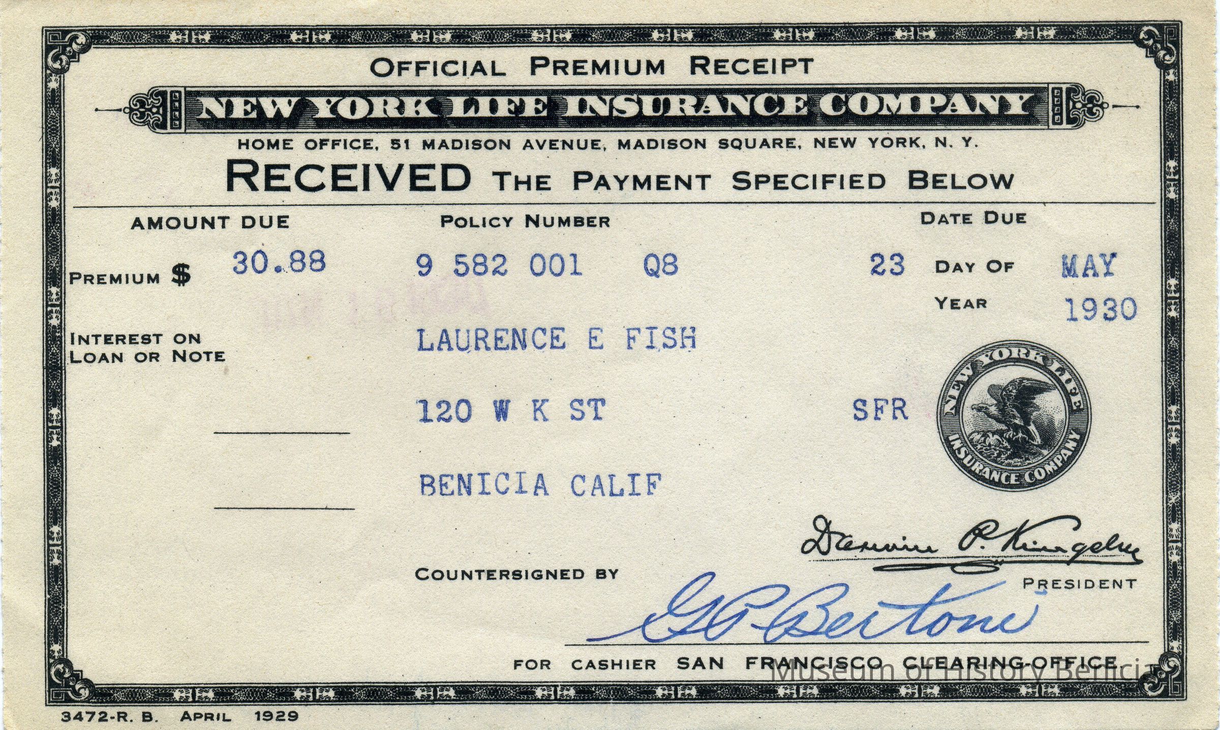 Receipts from New York Life Insurance Company from 05/23/1930 to 12/10/1934. Most are for payment of premiums and a few are for dividends paid at the end of a year. All are for Lawerence and Ardella Fish.Collection