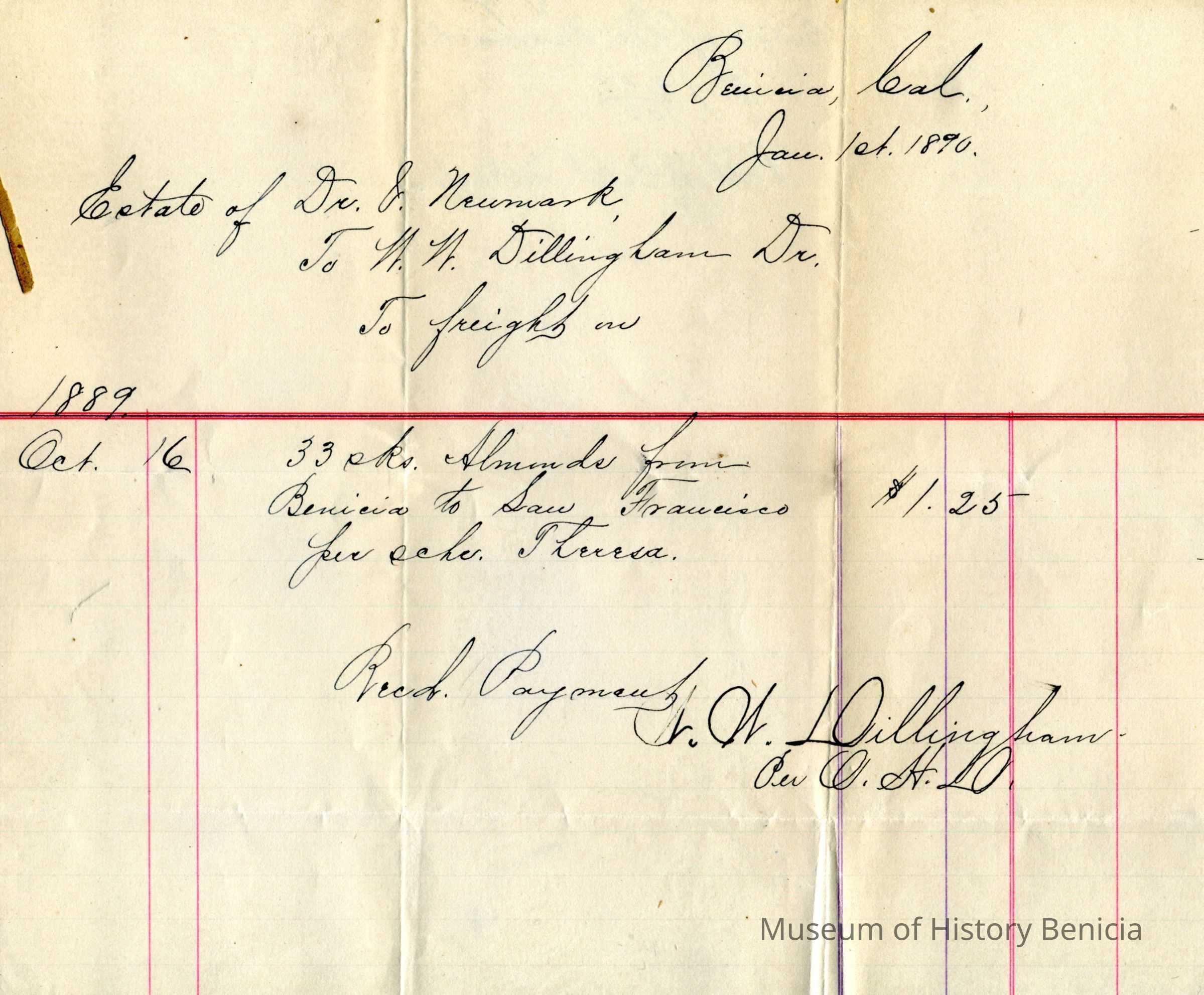 Receipt from Estate of Dr. S. Newmark to W.W. Dillingham Dr. for 33 lbs of almonds sent to SF 01/01/1890.