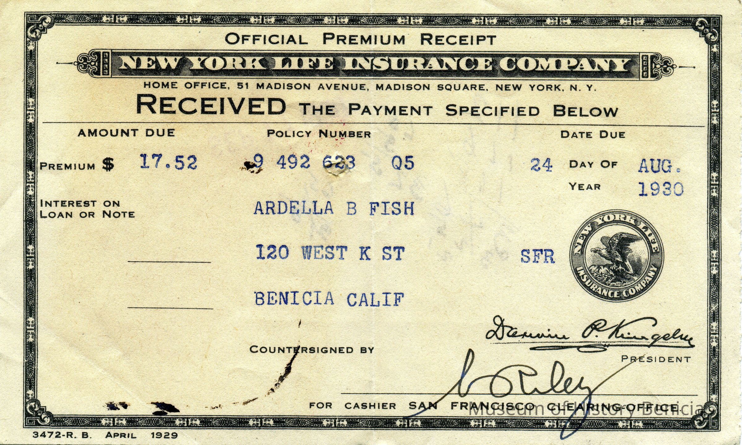 Receipts from New York Life Insurance Company from 05/23/1930 to 12/10/1934. Most are for payment of premiums and a few are for dividends paid at the end of a year. All are for Lawerence and Ardella Fish.Collection